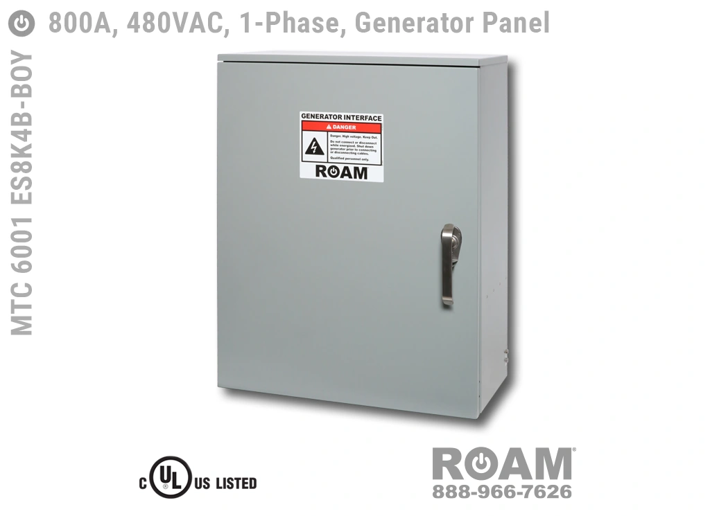 The standard in safety and outdoor reliability, Roam’s line of Generator Interface Panels makes connecting a portable generator to your site fast, easy, and most importantly—safe. The MTC 6001 ES8KvB line is part of Roam’s UL Listed (US & Canada) series of single-phase Generator Interface Panels. Generator Interface Panels like those made by Roam are also known in various industries under other names such as Generator Connector Panels, Tap Boxes, Inlet Boxes, Docking Stations, Generator Plugs, Gen Boxes, and Generator Quick Connects. Roam uses genuine Cooper Crouse-Hinds Cam-Lok brand connectors. Similar compatible connectors are sometimes referred to as “Cam-Lock” connectors by their manufacturers, distributors, and/or users.