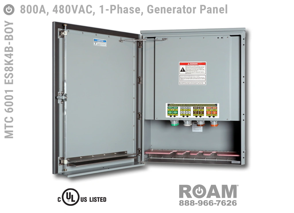 Roam offers MTC 6001 ES8KvB Generator Panels in models that support up to 240 VAC (120v, 208v, 230v, 240v), up to 480 VAC (277v, 330v, 440v, 480v), and up to 600 VAC (575v, 577v, 600v), which are UL Listed and cUL Listed (Canada) at those voltage levels. Brown-Orange color coding (for labels, Cam-Locks, & Cam-Lock spring caps) is normally used for most 480 VAC applications.