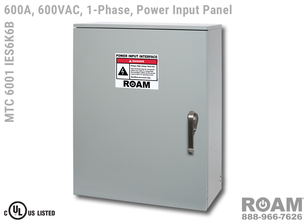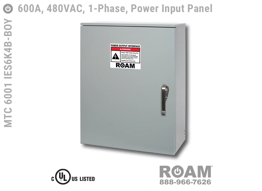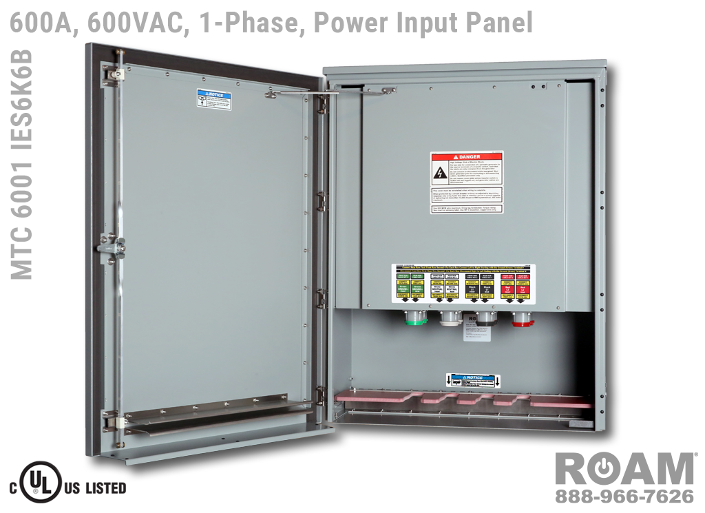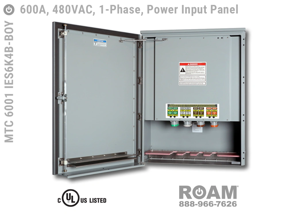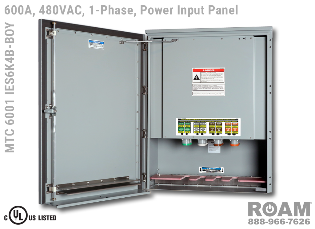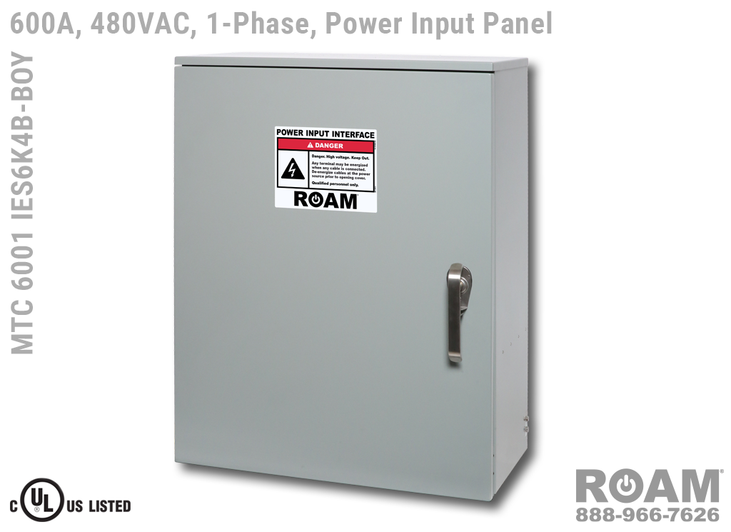 Roam offers the MTC 6001 IES6KvB Power Input Panel in models that support up to 240 VAC (120v, 208v, 230v, 240v)—MTC 6001 IES6K2B, up to 480 VAC (277v, 330v, 440v, 480v)—MTC 6001 IES6K4B-BOY, and up to 600 VAC (575v, 577v, 600v)—MTC 6001 IES6K6B. All of the 600A panels are UL Listed and cUL Listed (Canada) at those voltage levels. Brown-Orange-Yellow color coding (for labels, Cam-Locks, & Cam-Lock spring caps) is normally used for most 480 VAC applications.