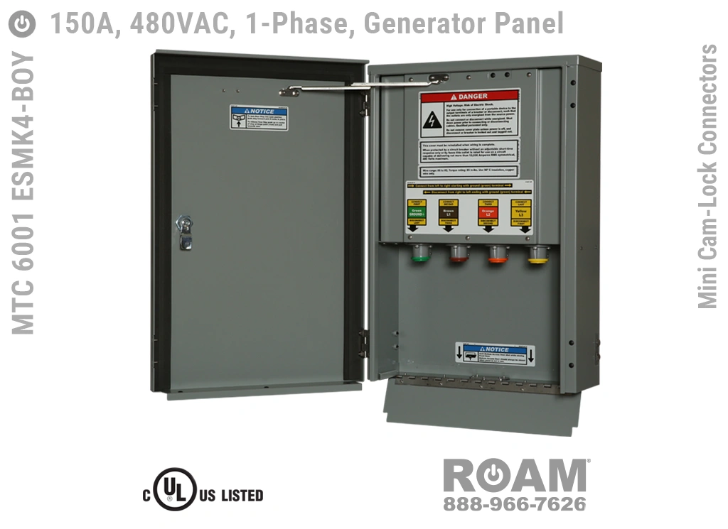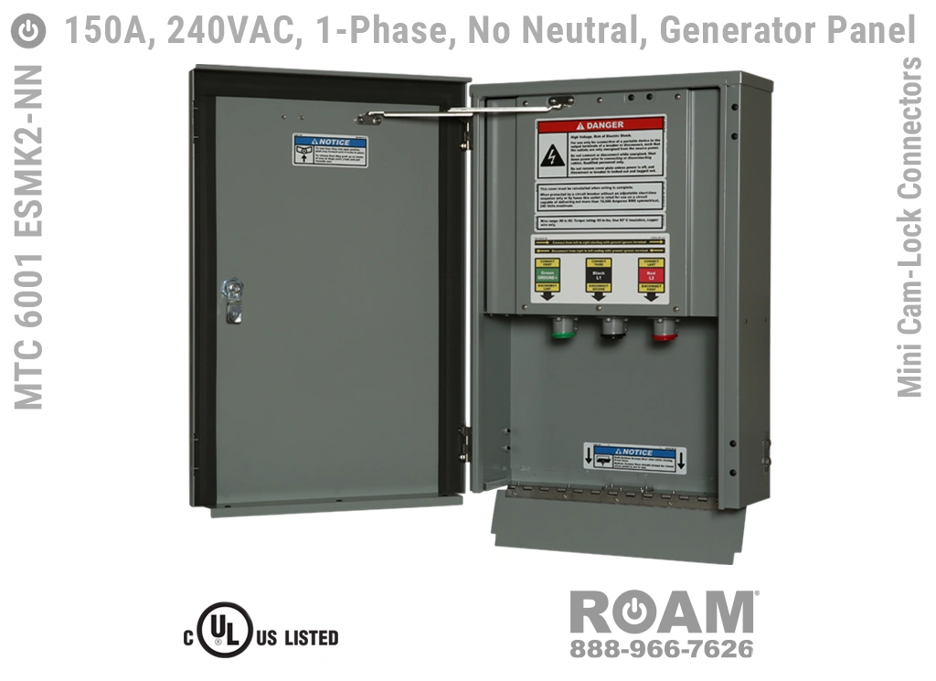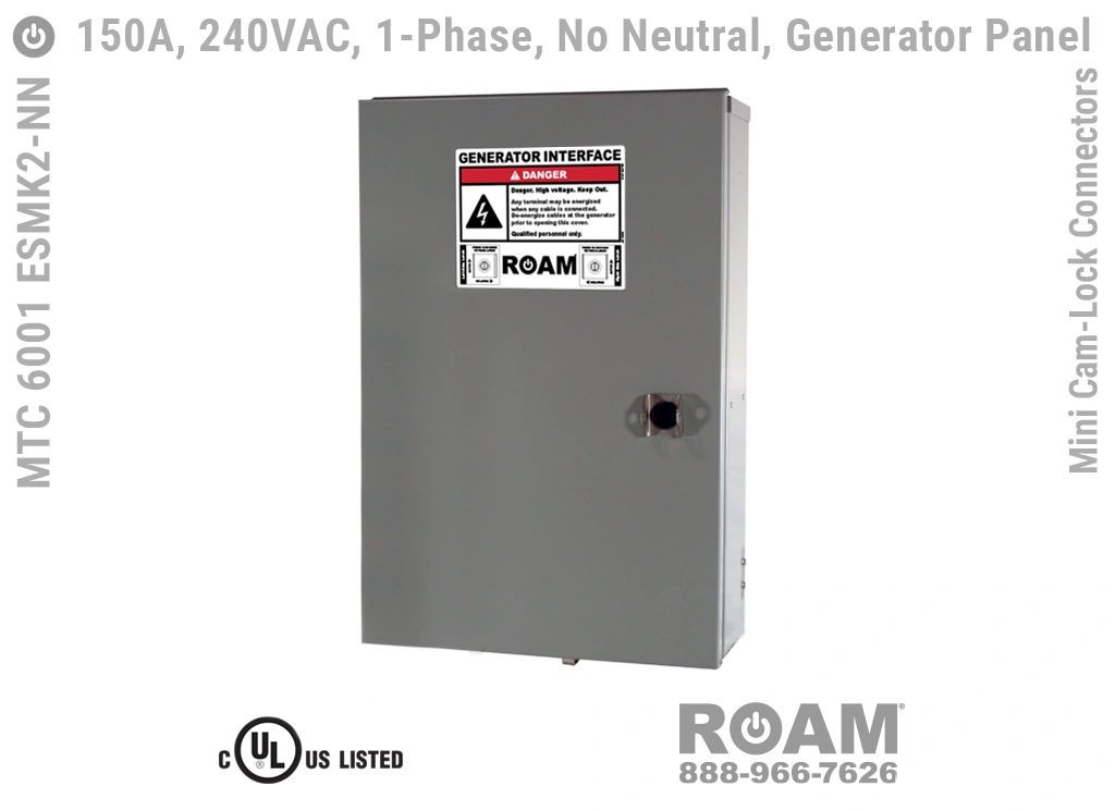 Roam’s MTC 6001 ESMKv Generator Boxes accept from #8 to #2 (AWG) cables via Mini Cam-Lock plugs on the generator cable side, and from #8 to #2 (AWG) cables on the internal wireway side.