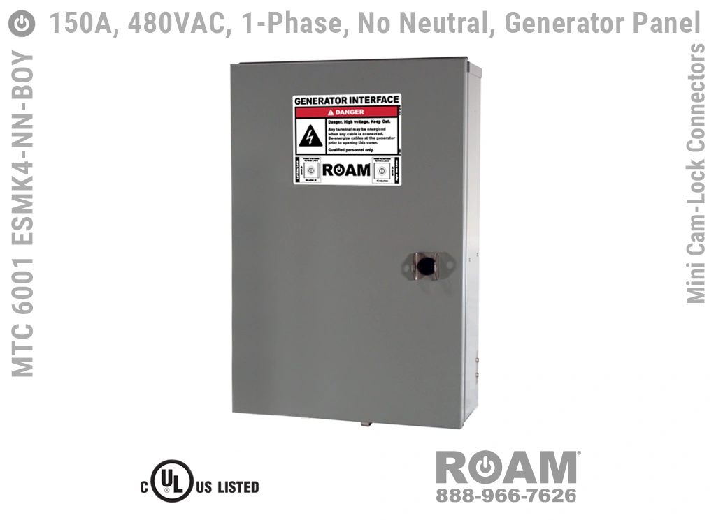 Roam offers the MTC 6001 ESMKv Generator Panel in models that support up to 240 VAC (120v, 208v, 230v, 240v)—MTC 6001 ESMK2, up to 480 VAC (277v, 330v, 440v, 480v)—MTC 6001 ESMK4-BOY, and up to 600 VAC (575v, 577v, 600v)—MTC 6001 ESMK6. Brown-Orange-Yellow color coding (for labels, Mini Cam-Locks, & Spring Caps) is normally used for most 480 VAC applications.