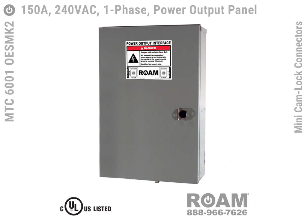 Roam’s MTC 6003 OESMKv Power Output Panels accept from #8 to #2 (AWG) cables via Mini Cam-Lock plugs on the generator cable side, and from #8 to #2 (AWG) cables on the internal wireway side.
