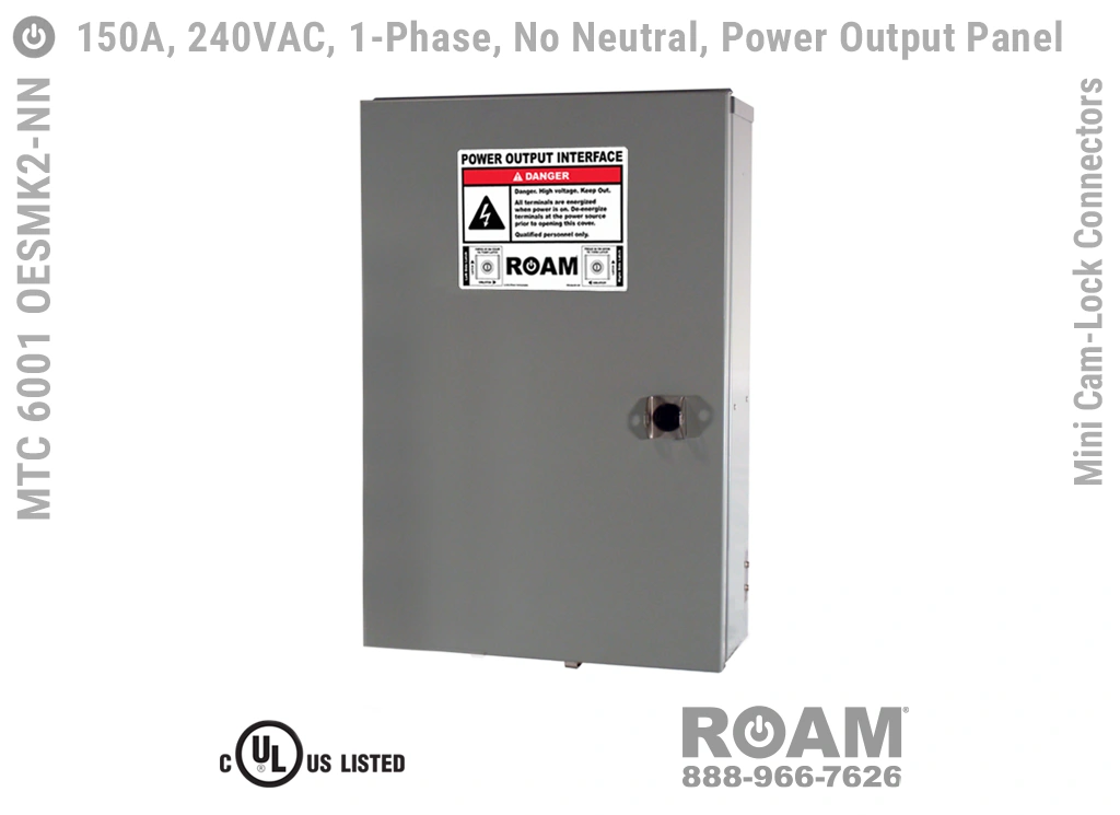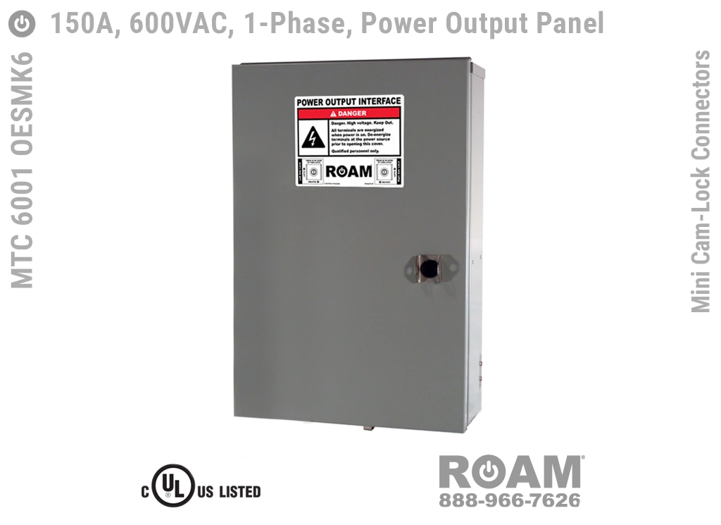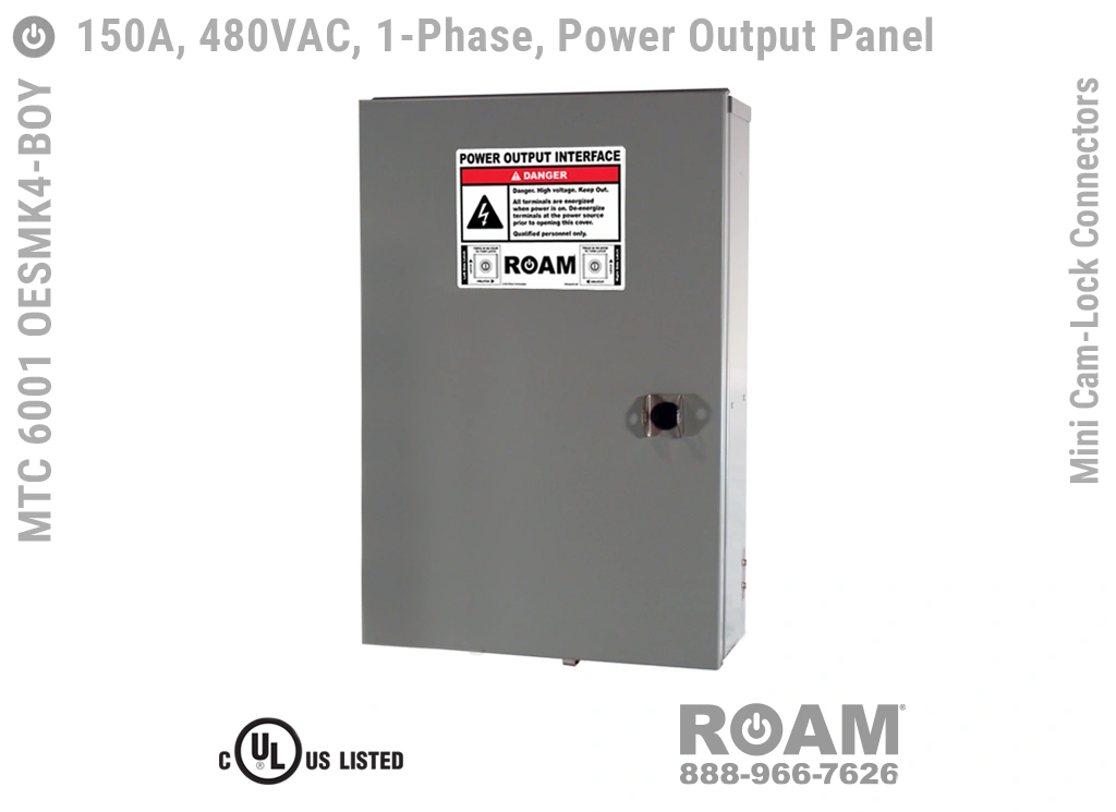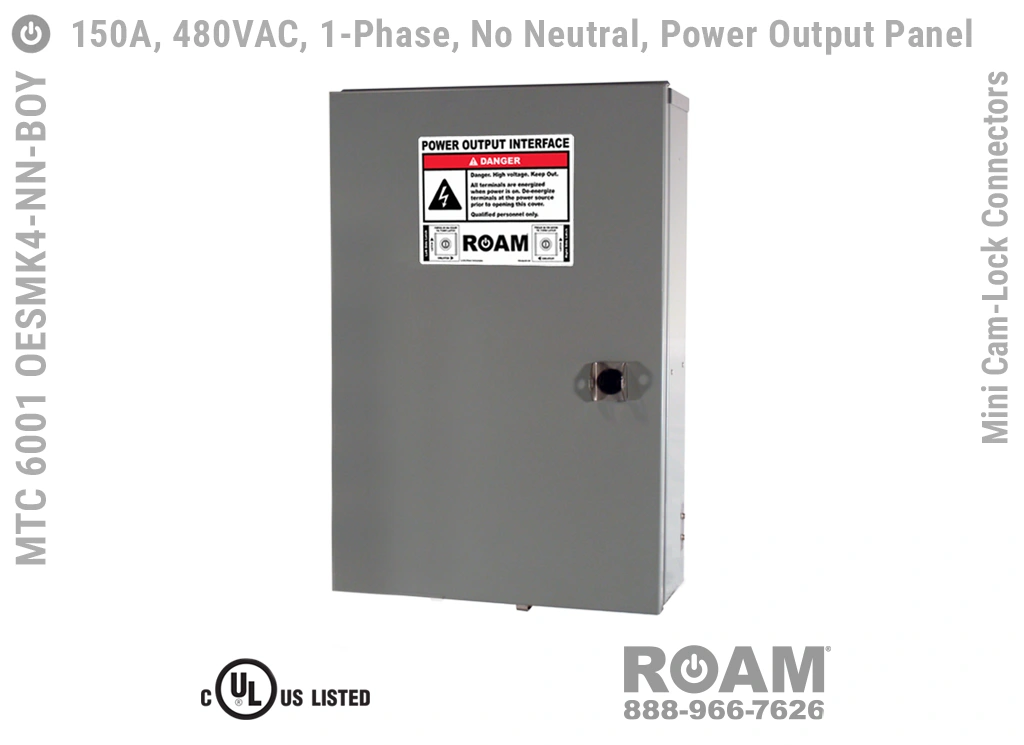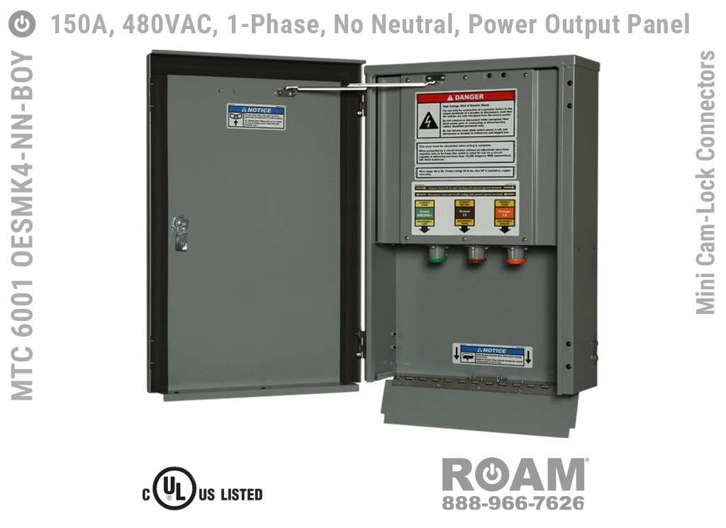 Roam offers the MTC 6001 OESMKv Power Output Panel in models that support up to 240 VAC (120v, 208v, 230v, 240v)—MTC 6001 OESMK2, up to 480 VAC (277v, 330v, 440v, 480v)—MTC 6001 OESMK4-BOY, and up to 600 VAC (575v, 577v, 600v)—MTC 6001 OESMK6. Brown-Orange-Yellow color coding (for labels, Mini Cam-Loks, & Spring Caps) is normally used for most 480 VAC applications.