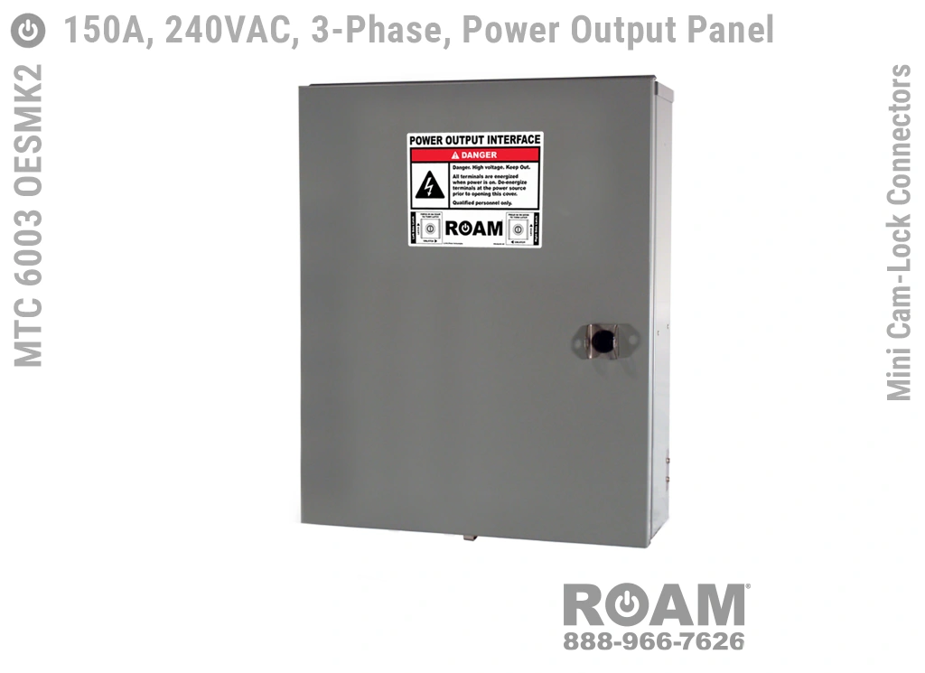 Roam’s MTC 6003 OESMKv Power Output Boxes accept from #8 to #2 (AWG) cables via Mini Cam-Lock plugs on the generator cable side, and from #8 to #2 (AWG) cables on the internal wireway side.