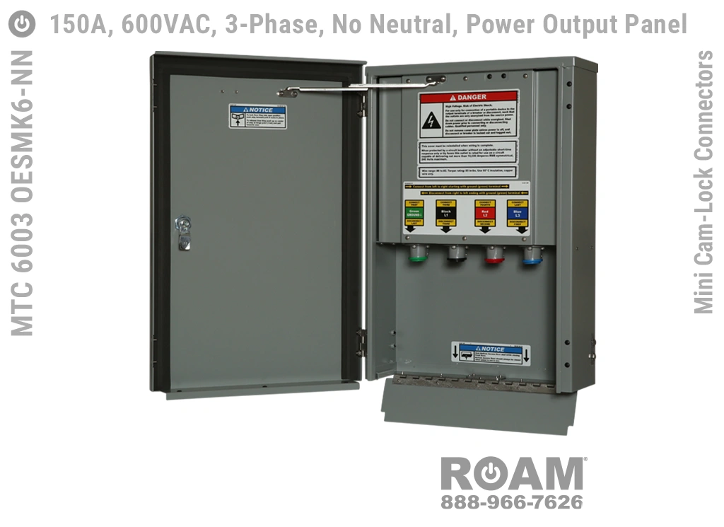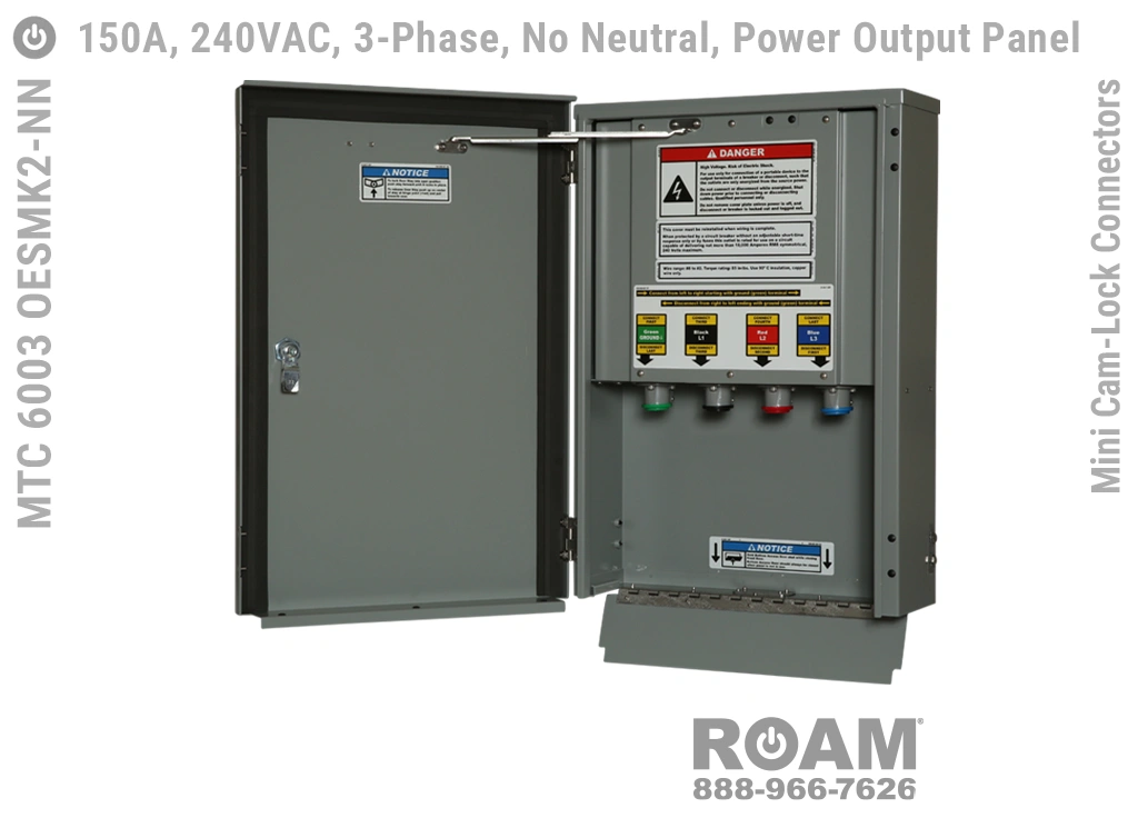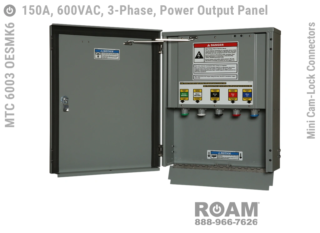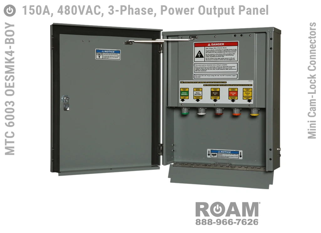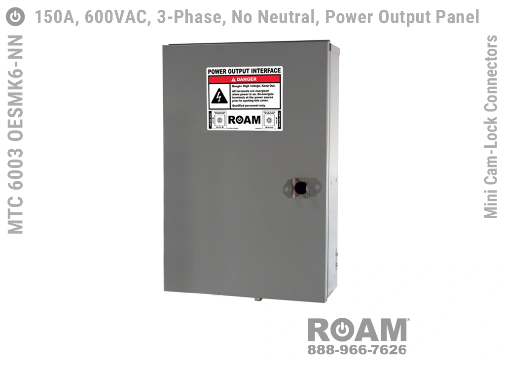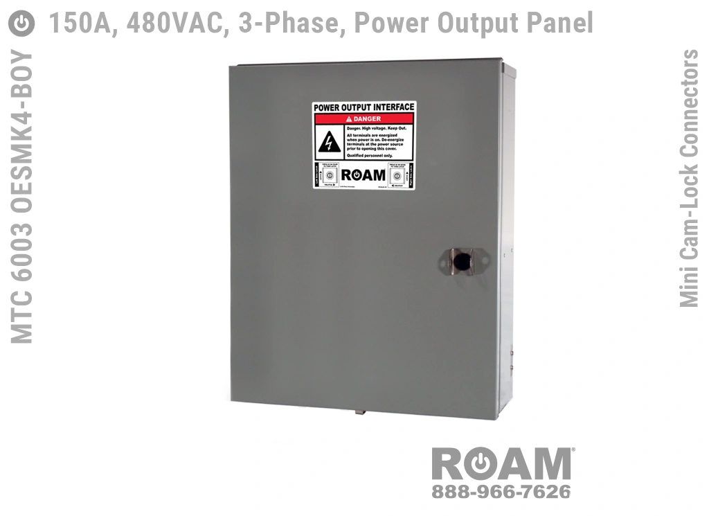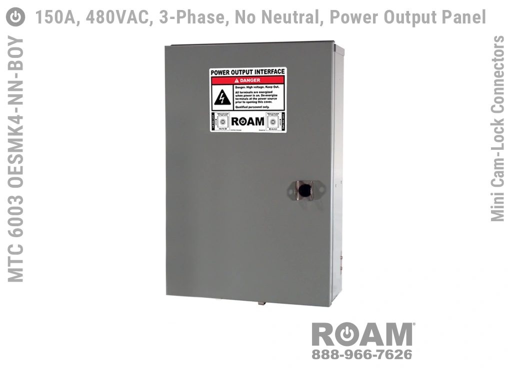 Roam offers the MTC 6003 OESMKv Power Output Panel in models that support up to 240 VAC (120v, 208v, 230v, 240v)—MTC 6003 OESMK2, up to 480 VAC (277v, 330v, 440v, 480v)—MTC 6003 OESMK4-BOY, and up to 600 VAC (575v, 577v, 600v)—MTC 6003 OESMK6. Brown-Orange-Yellow color coding (for labels, Mini Cam-Locks, & Spring Caps) is normally used for most 480 VAC applications.