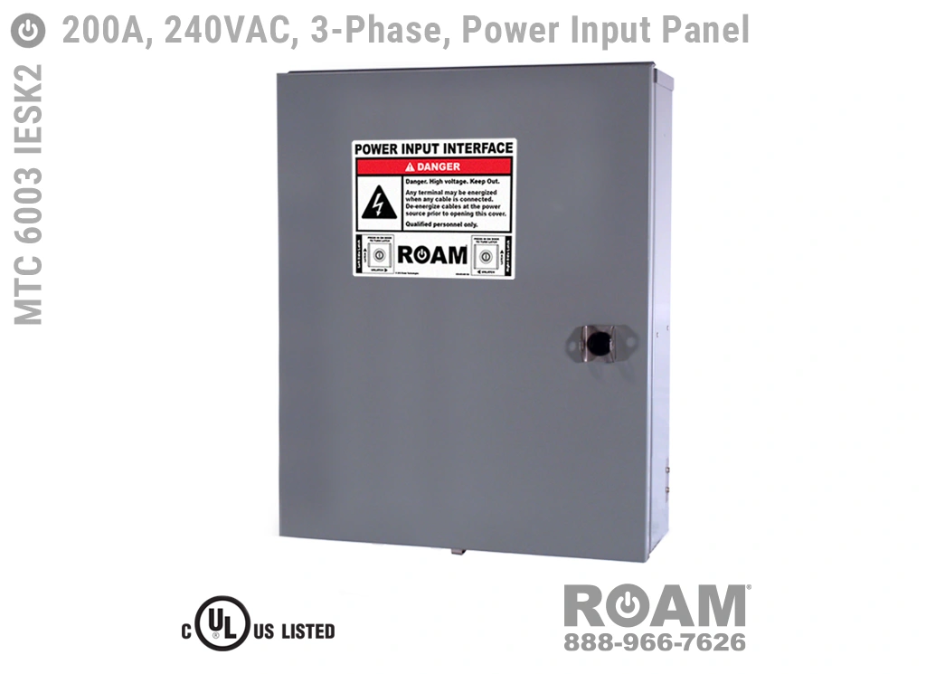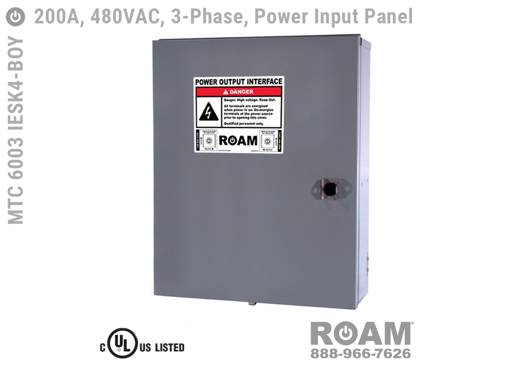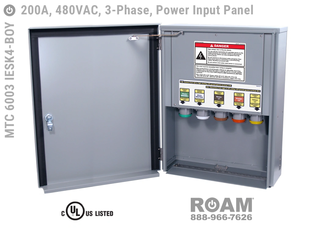 Roam offers MTC 6003 IESKv Power Input Panels in models that support up to 240 VAC (120v, 208v, 230v, 240v)—MTC 6003 IESK2, up to 480 VAC (277v, 330v, 440v, 480v)—MTC 6003 IESK4-BOY, and up to 600 VAC (575v, 577v, 600v)—MTC 6003 IESK6, which are UL Listed and cUL Listed (Canada) at those voltage levels. Brown-Orange color coding (for labels, Cam-Locks, & Cam-Lock spring caps) is normally used for most 480 VAC applications.