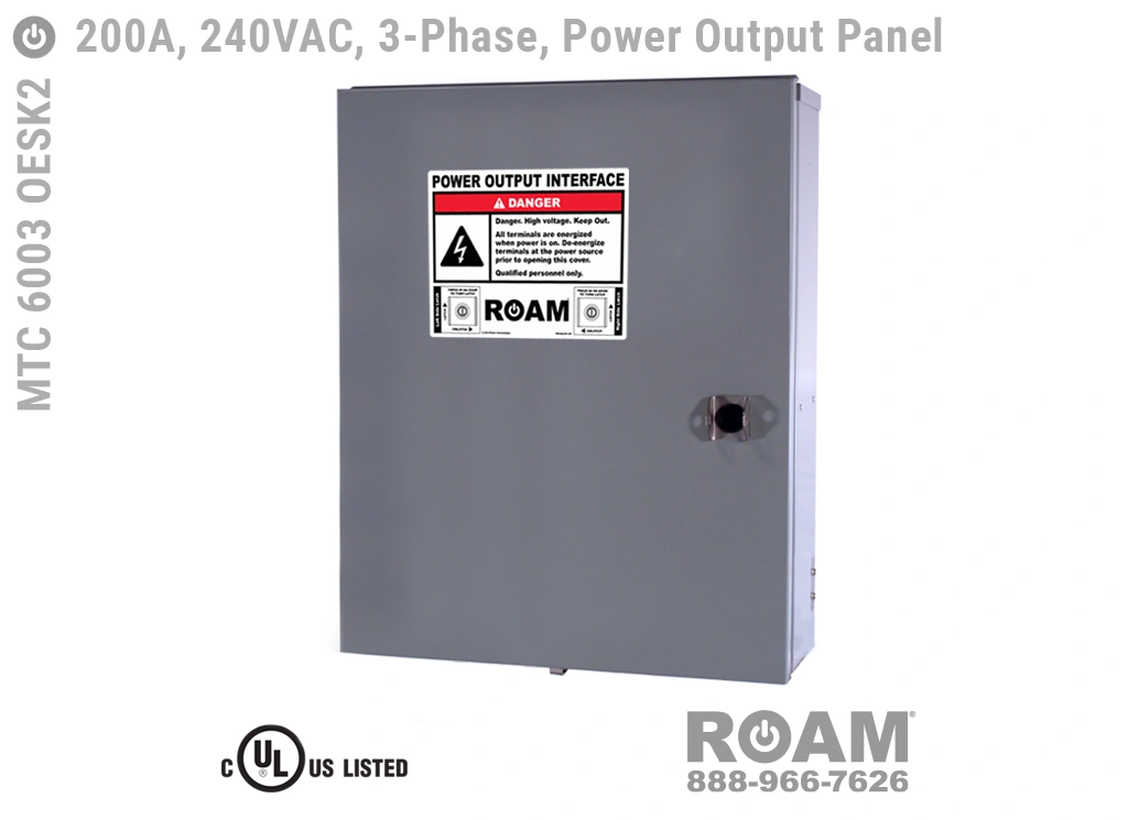 Roam’s MTC® 6003 OESKv series (“v” = Voltage Code) of Power Output Panels provides a rugged and cost-effective exterior connection point for high-capacity external power loads. These Power Output Panels use E1016 (J-Series/16 Series) Female Cam-Lok* brand connectors and are part of Roam’s MTC 6003 UL Listed (US & Canada) series of three-phase power output panels.