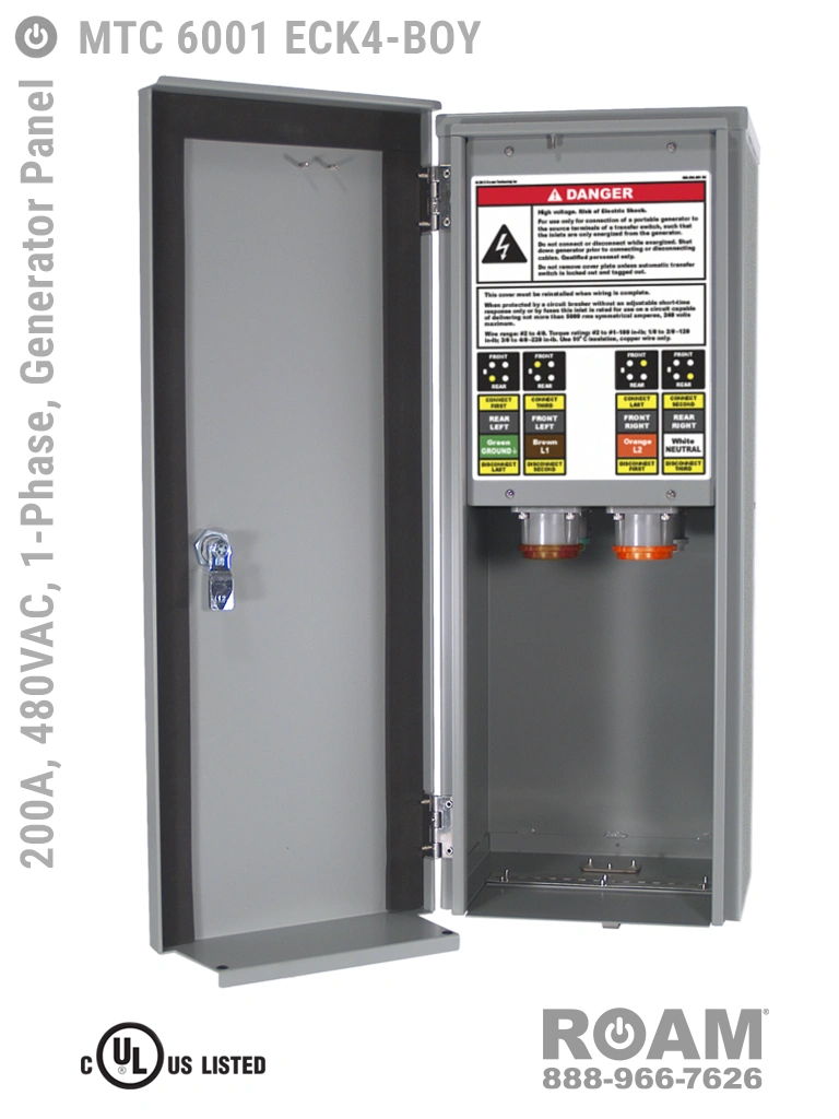 Roam offers MTC 6001 ECKv Generator Panels in models that support up to 240 VAC (120v, 208v, 230v, 240v)—MTC 6001 ECK2, up to 480 VAC (277v, 330v, 440v, 480v)—MTC 6001 ECK4-BOY, and up to 600 VAC (575v, 577v, 600v)—MTC 6001 ECK6, which are UL Listed and cUL Listed (Canada) at those voltage levels. Brown-Orange color coding (for labels, Cam-Locks, & Cam-Lock spring caps) is normally used for most 480 VAC applications.