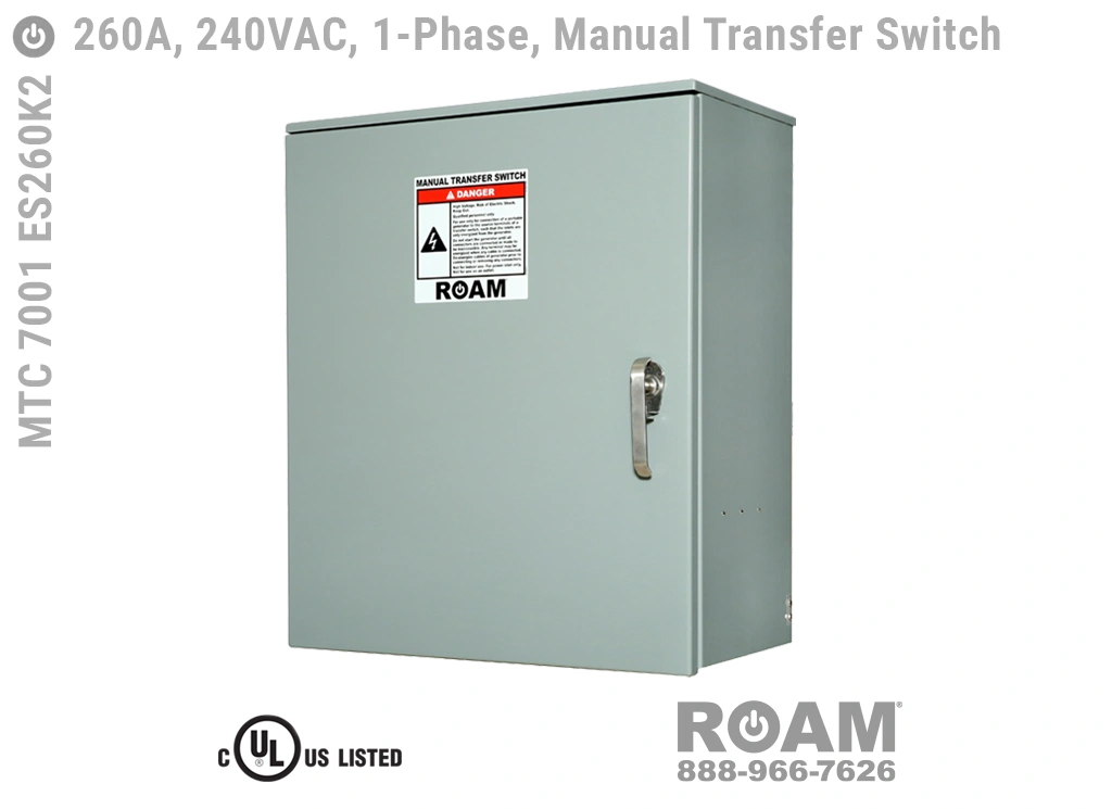 Roam’s MTC 7001 ES260Kv series (“v” = Voltage Code) of 260 Amp Manual Transfer Switch panels provide a secure and easy-to-connect Cam-Lock connection between a generator and building main power, letting you switch a building main circuits (by means of physically turning a switch) between utility power and generator power. Roam’s Manual Transfer Switch (MTS) panels combine a Generator Connection Box and a Transfer Switch, providing a single-panel solution for exterior connection and switching of emergency power. Roam’s MTS panels are UL 1008 listed and use E1016 (J-Series/16 Series) Male Cam-Lock connectors.