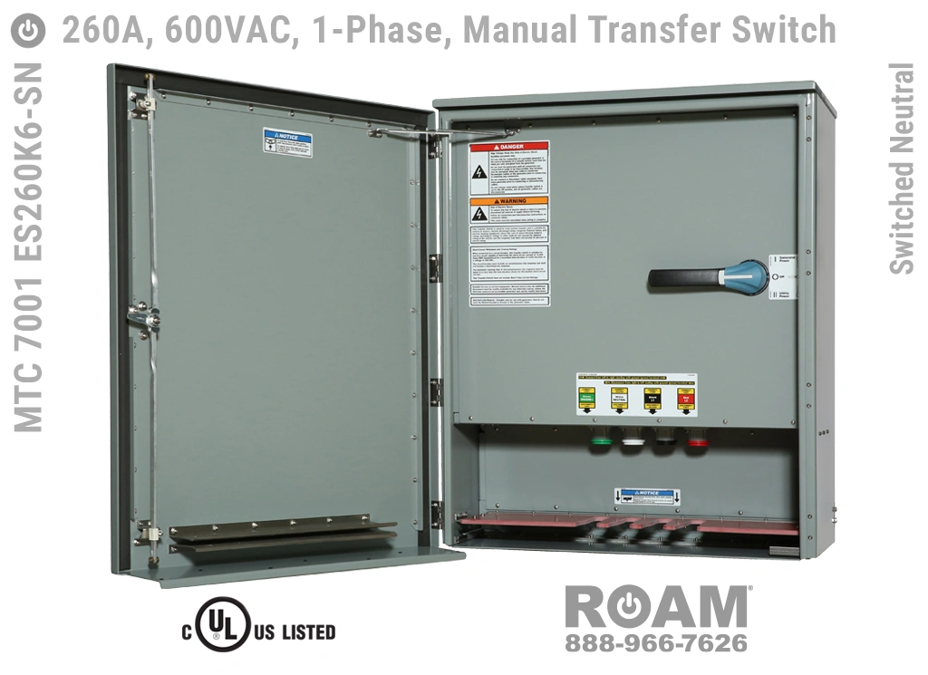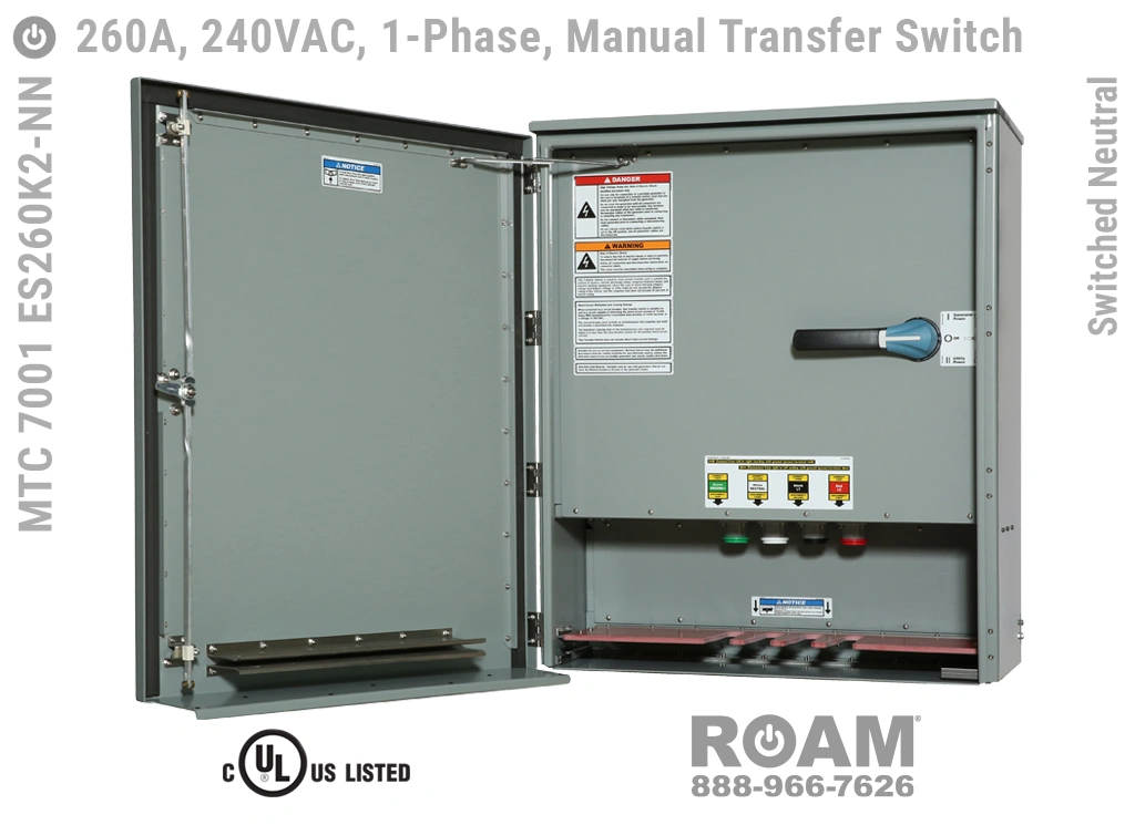 Many of Roam’s MTC 7001 ES260Kv series Manual Transfer Switch panels are Service Entry rated, meaning that these panels are suitable for use as service equipment/service disconnects. A service disconnect is simply the first disconnect between the external power source (utility or generator) and building main circuits. All of our Service Entry rated MTS panels have a “-SE” extension in their part number. Service Entry rated panels are available with a standard UL listing (USA), but not with a cUL (Canadian) listing.