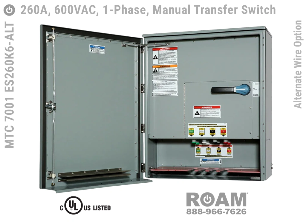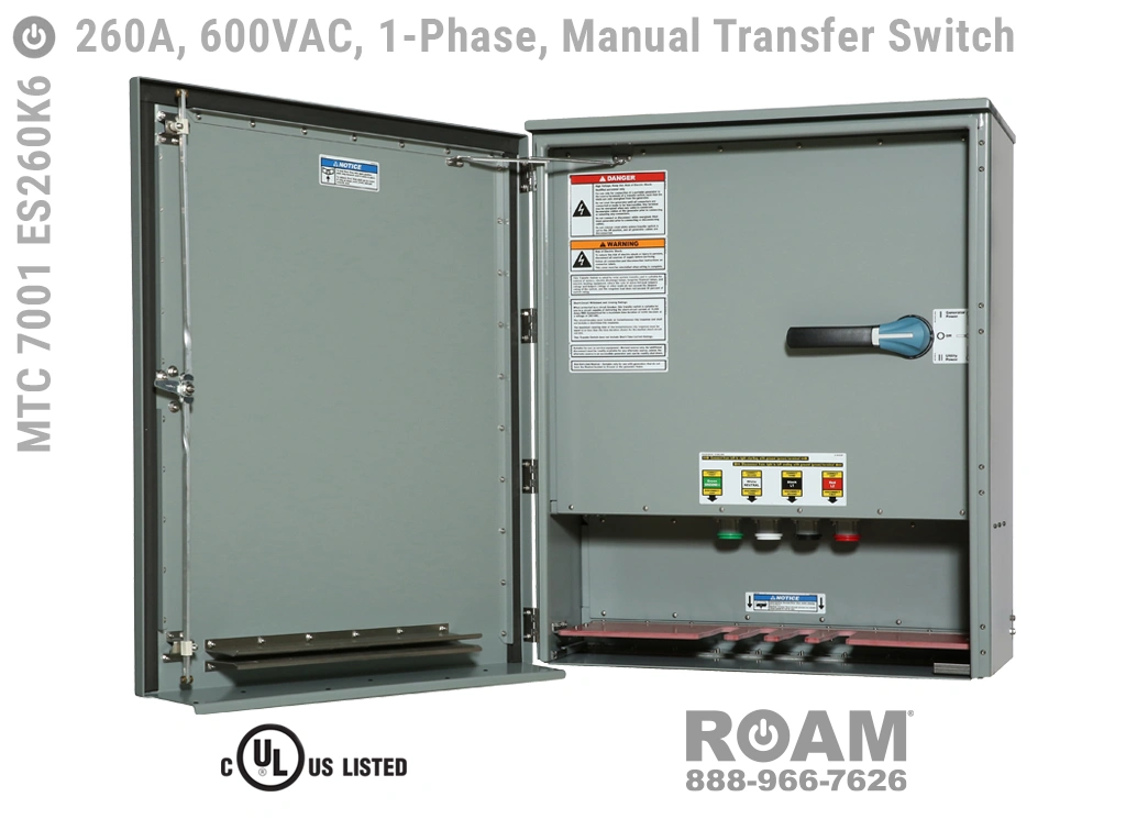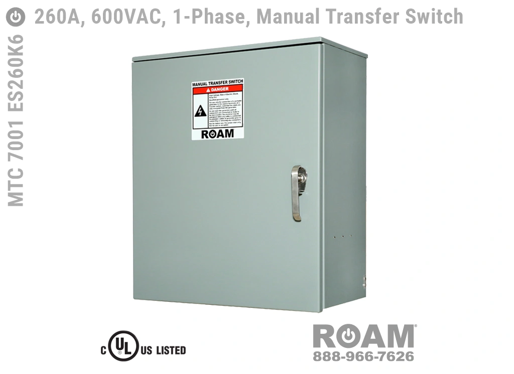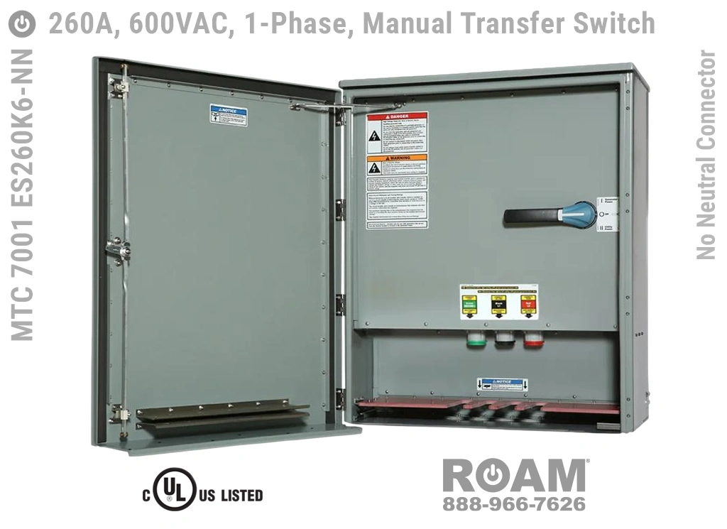 Voltages up to 600VACRoam offers MTC 7001 ES260Kv series 260 Amp Manual Transfer Switches in models that support up to 240 VAC (120v, 208v, 230v, 240v) and up to 600 VAC (575v, 577v, 600v), all of which are UL Listed at those voltage levels.