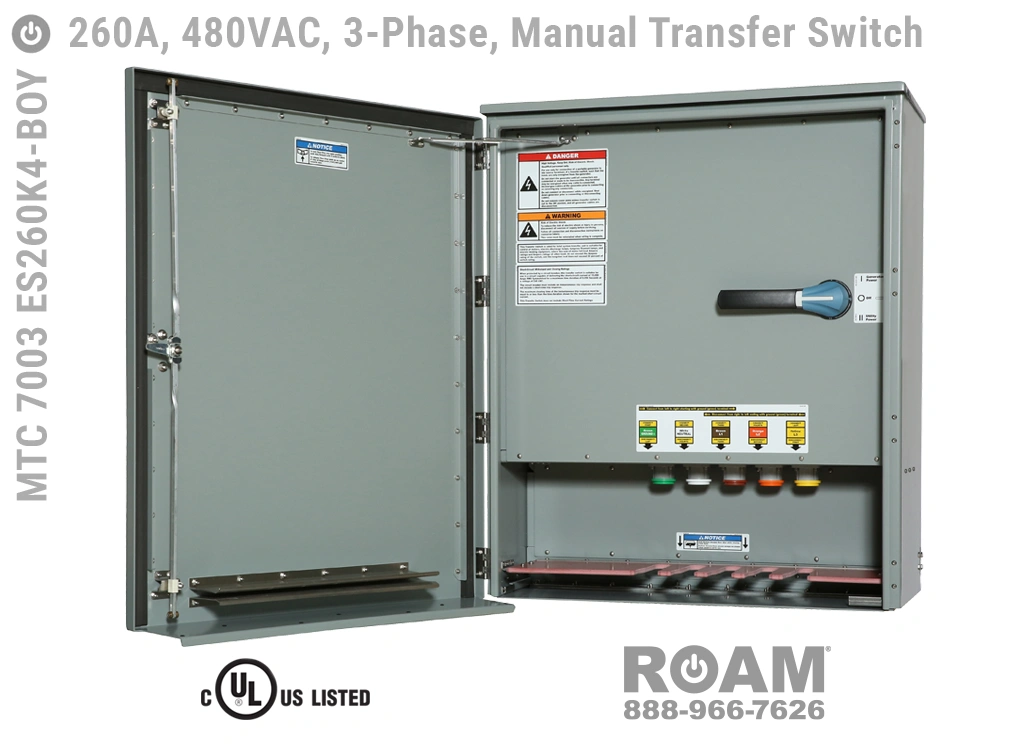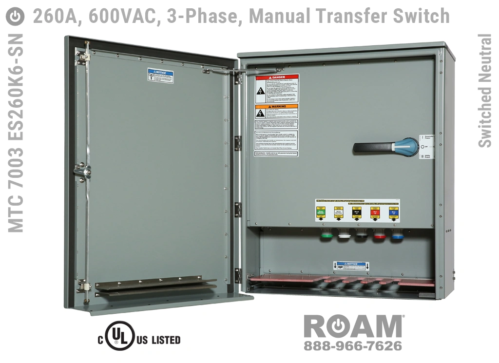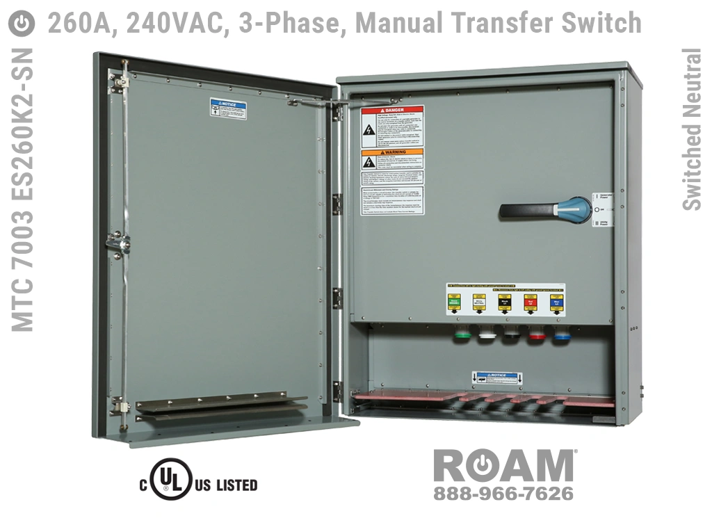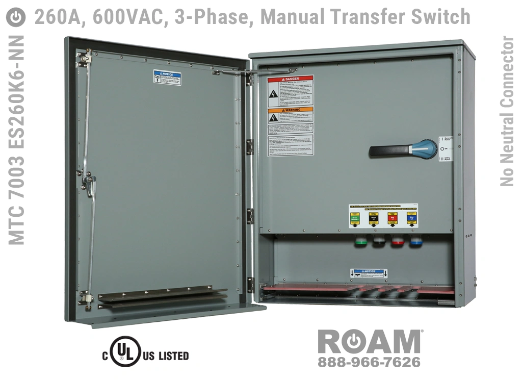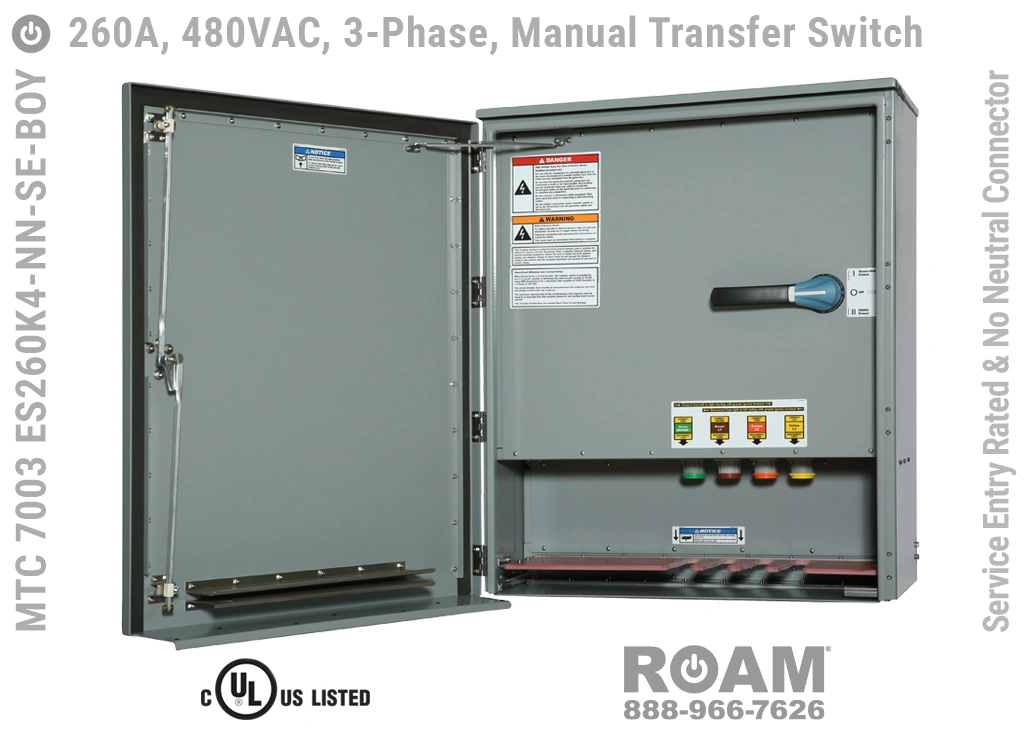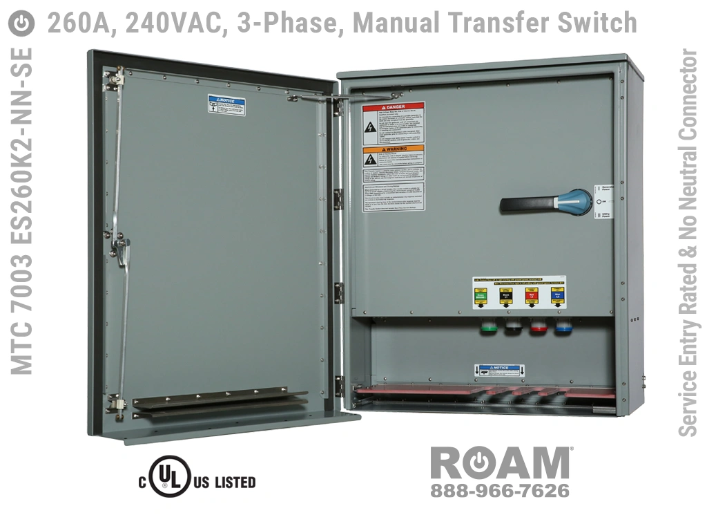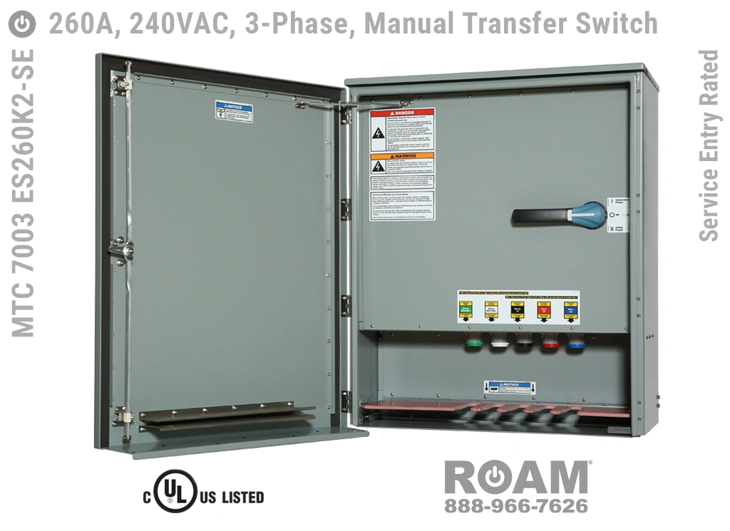Many of Roam’s MTC 7003 ES260Kv series Manual Transfer Switch panels are Service Entry rated, meaning that these panels are suitable for use as service equipment/service disconnects. A service disconnect is simply the first disconnect between the external power source (utility or generator) and building main circuits. All of our Service Entry rated MTS panels have a “-SE” extension in their part number. Service Entry rated panels are available with a standard UL listing (USA), but not with a cUL (Canadian) listing.