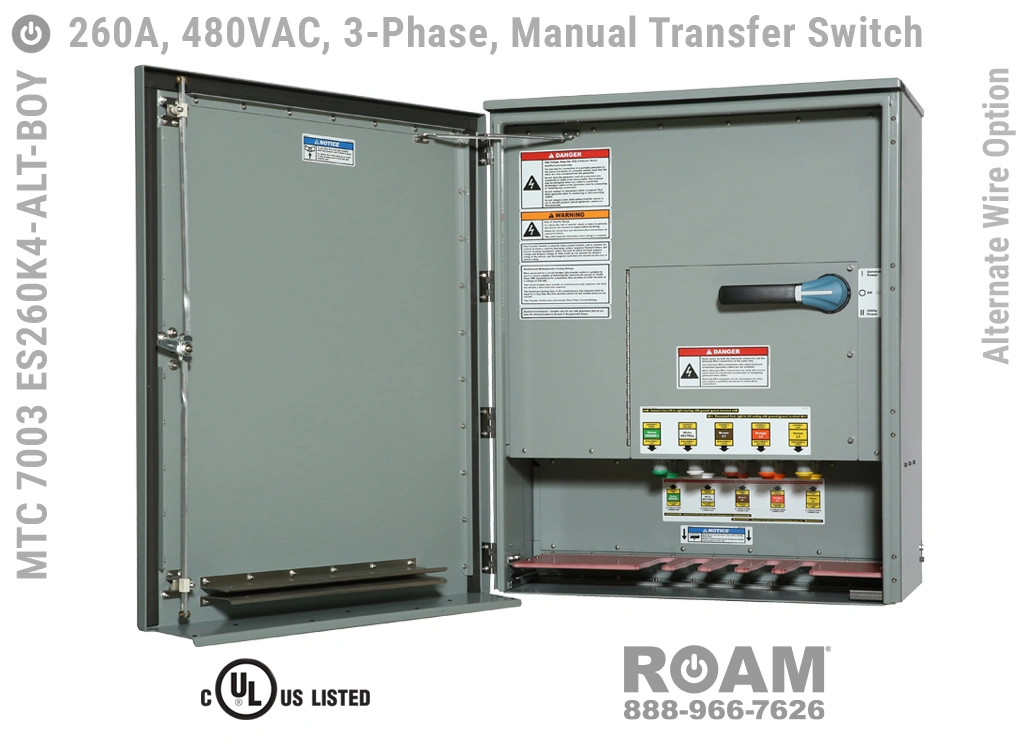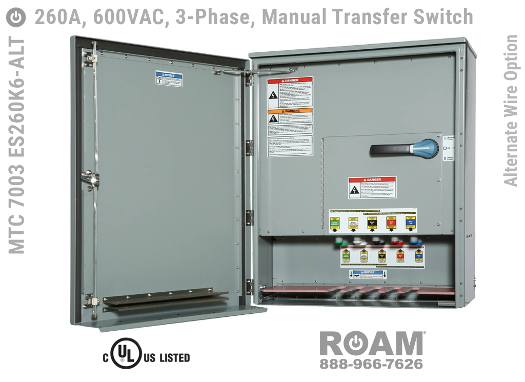 Roam offers an Alternate Wire option for its MTC 7003 ES260Kv 260A Manual Transfer Switch panel line designed for critical emergency power users, such as police/fire/EMS departments, utilities, government agencies, and military bases. This option allows generators to be securely connected to the MTS—even when Cam-Lock connectorized cables are unavailable.