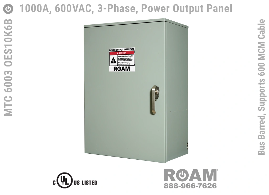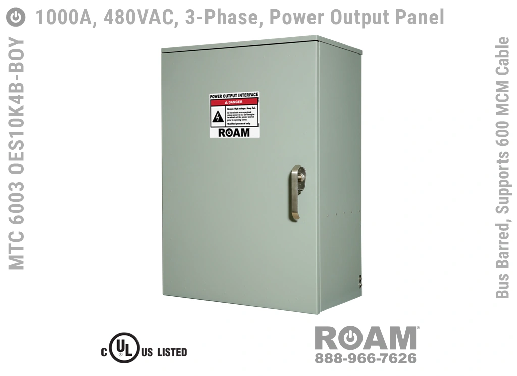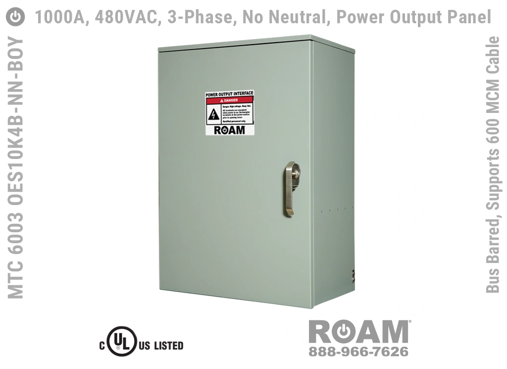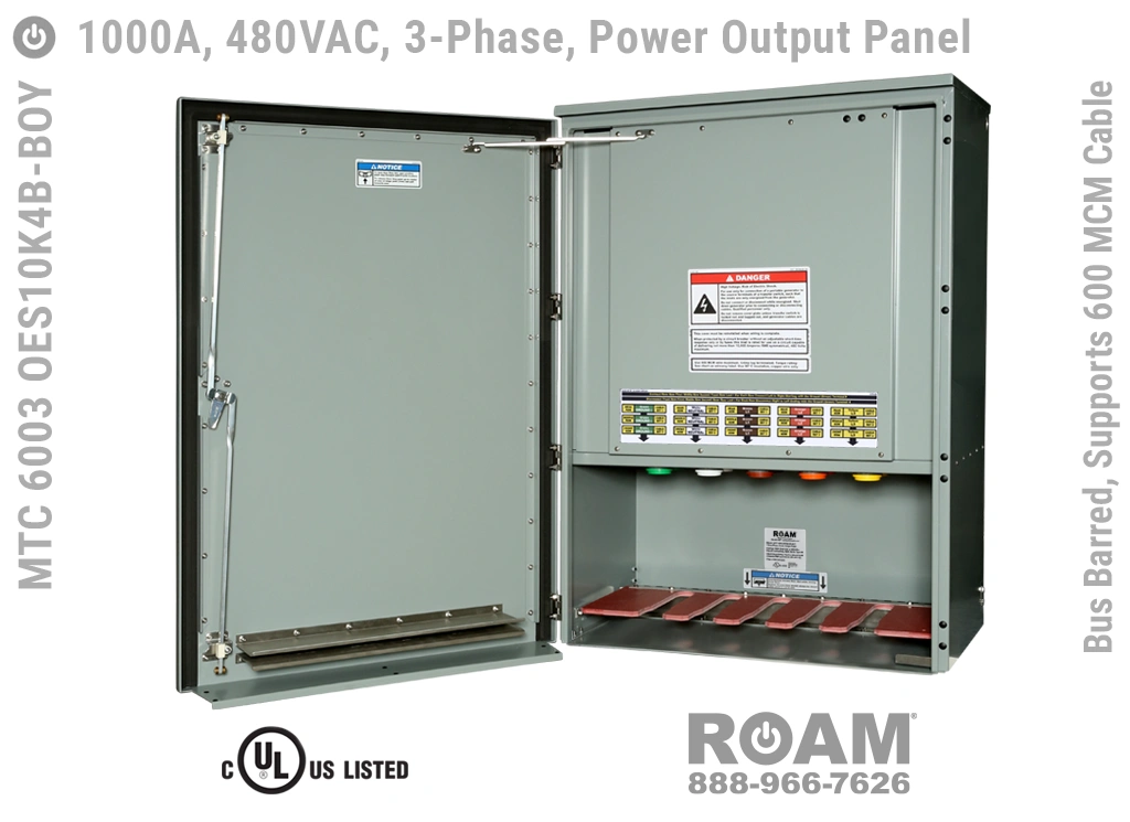 Roam offers the MTC 6003 OES10KvB Power Output Panel in models that support up to 240 VAC (120v, 208v, 230v, 240v)—MTC 6003 ES10K2B, up to 480 VAC (277v, 330v, 440v, 480v)—MTC 6003 OES10K4B-BOY, and up to 600 VAC (575v, 577v, 600v)—MTC 6003 OES10K6B. All of the 1000A panels are UL Listed and cUL Listed (Canada) at those voltage levels. Brown-Orange-Yellow color coding (for labels, Cam-Locks, & Cam-Lock spring caps) is normally used for most 480 VAC applications.
