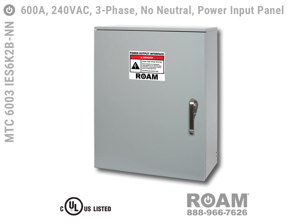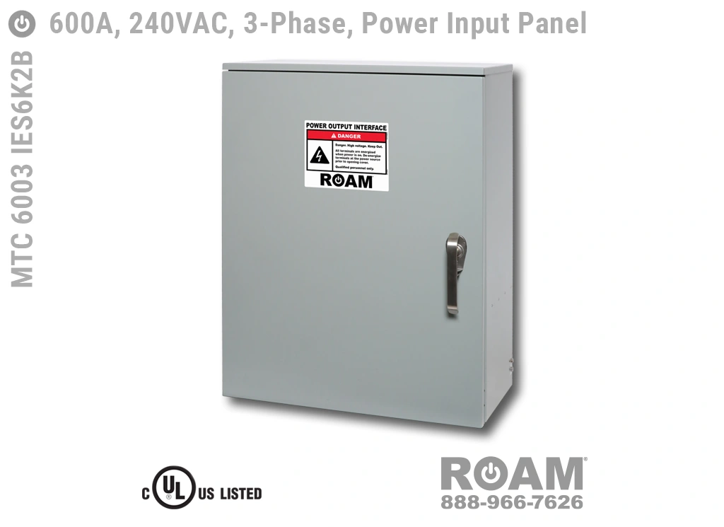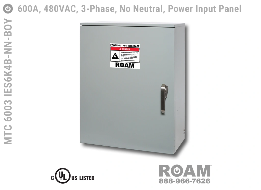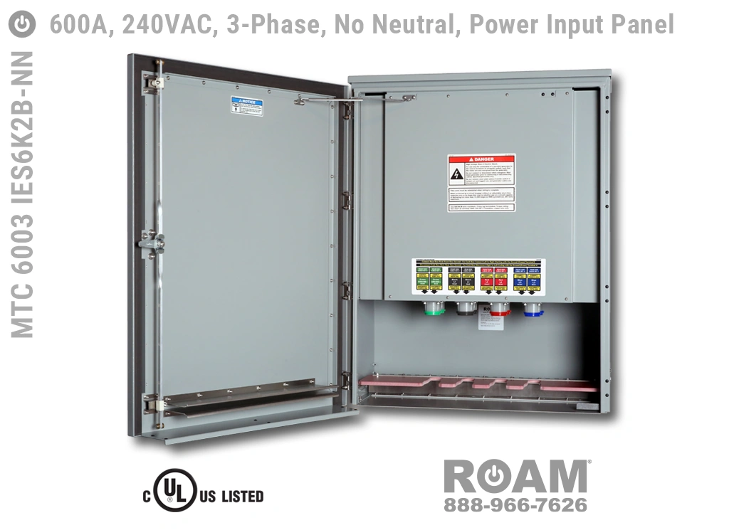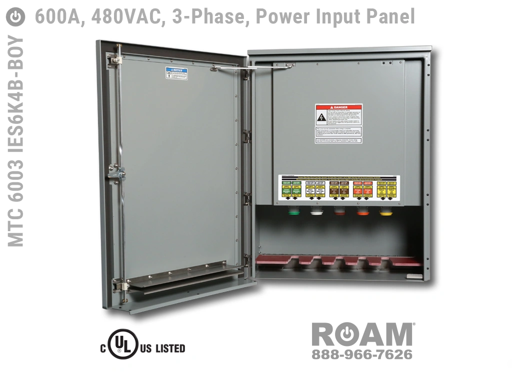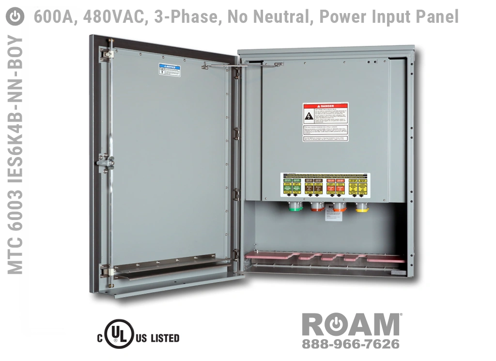 Roam offers the MTC 6003 IES6KvB Power Input Panel in models that support up to 240 VAC (120v, 208v, 230v, 240v)—MTC 6003 IES6K2B, up to 480 VAC (277v, 330v, 440v, 480v)—MTC 6003 IES6K4B-BOY, and up to 600 VAC (575v, 577v, 600v)—MTC 6003 IES6K6B. All of the 600A panels are UL Listed and cUL Listed (Canada) at those voltage levels. Brown-Orange-Yellow color coding (for labels, Cam-Locks, & Cam-Lock spring caps) is normally used for most 480 VAC applications.