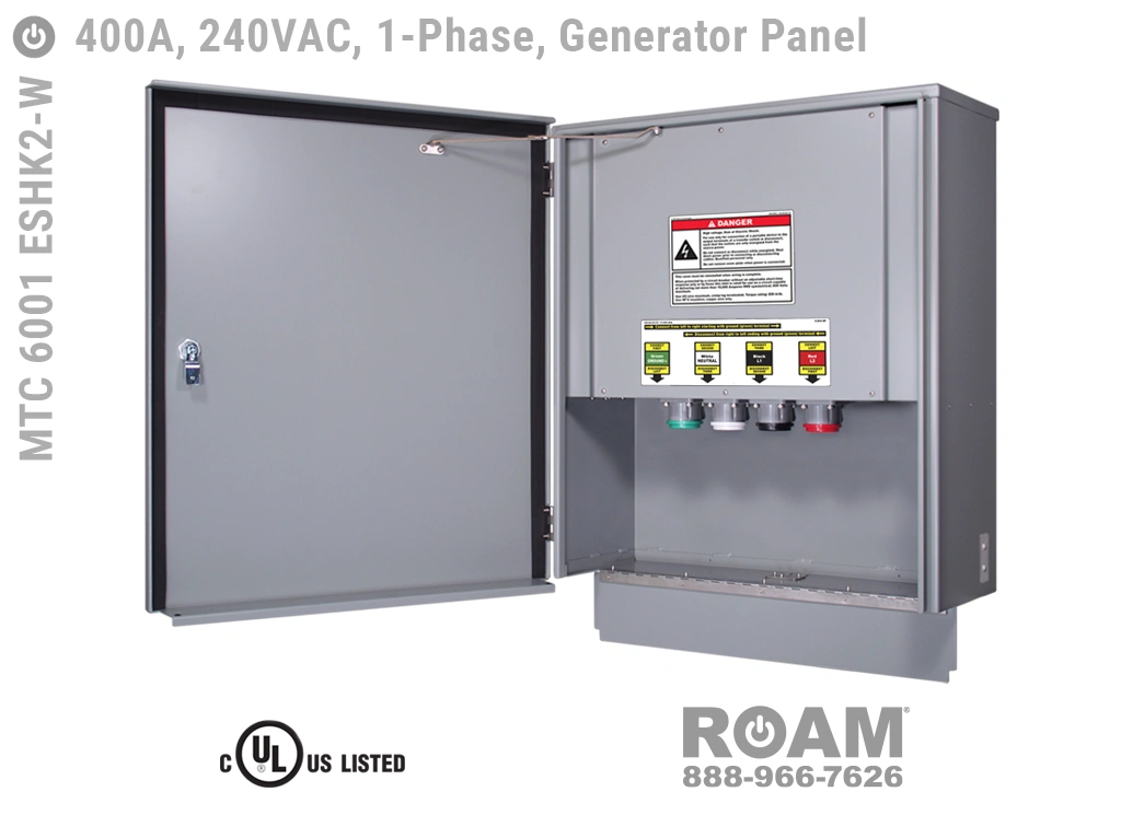 Roam’s MTC® 6001 ESHKv-W series (“v” = Voltage Code) of Generator Interface Panels (Generator Connection Boxes) provide a rugged and cost-effective exterior connection point for emergency power. These Generator Interface Panels use E1016 (J-Series/16 Series) Male Cam-Lok* brand connectors and are part of Roam’s UL Listed (US & Canada) series of single-phase generator interface panels.