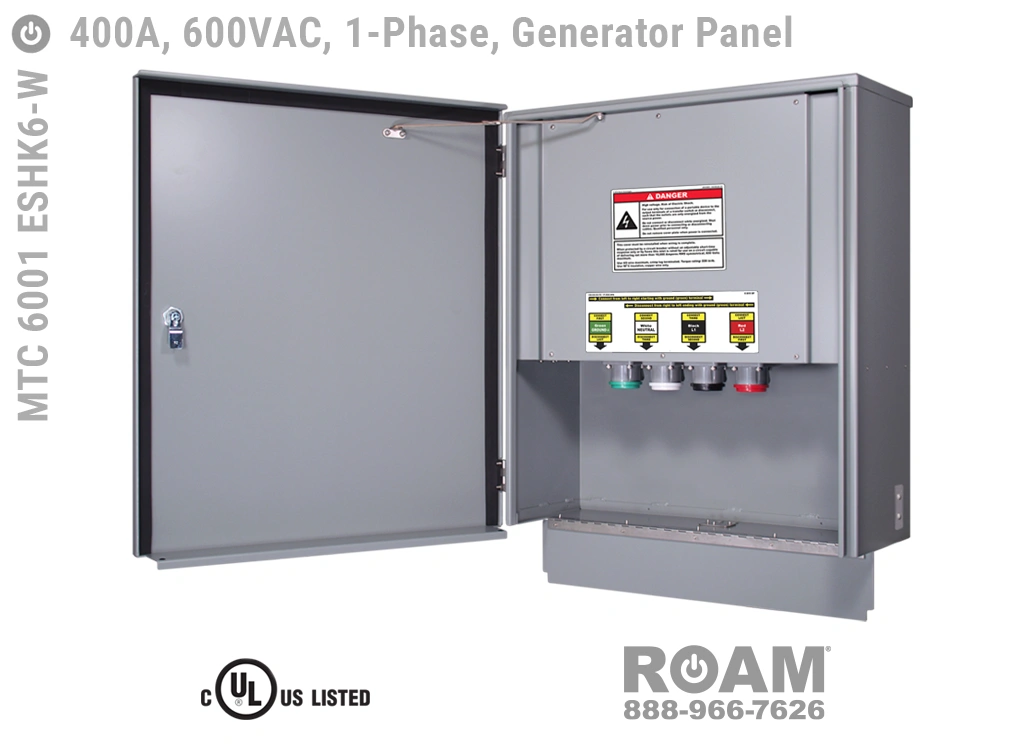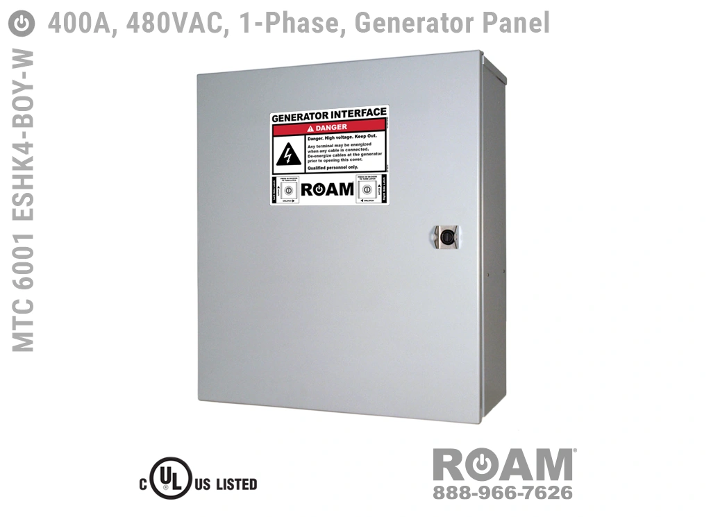 Roam offers MTC 6001 ESKv Generator Panels in models that support up to 240 VAC (120v, 208v, 230v, 240v)—MTC 6001 ESK2, up to 480 VAC (277v, 330v, 440v, 480v)—MTC 6001 ESK4-BOY, and up to 600 VAC (575v, 577v, 600v)—MTC 6001 ESK6, which are UL Listed and cUL Listed (Canada) at those voltage levels. Brown-Orange color coding (for labels, Cam-Locks, & Cam-Lock spring caps) is normally used for most 480 VAC applications.