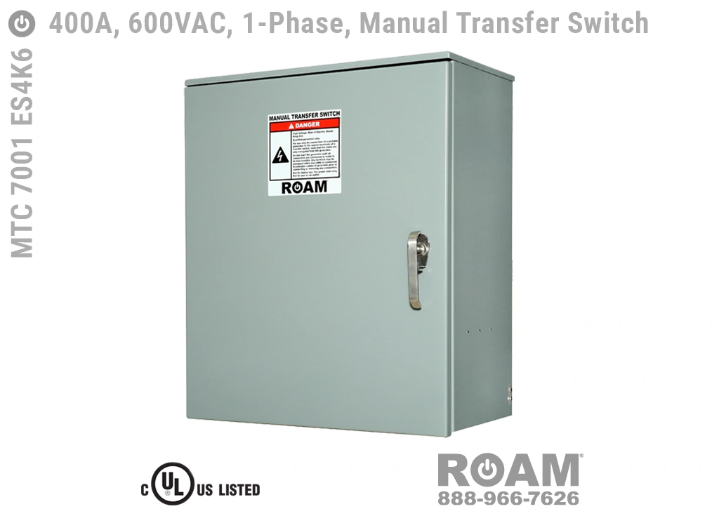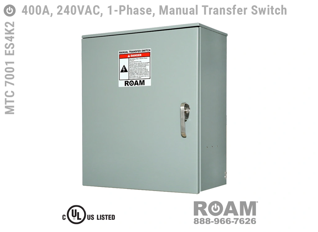 Roam’s MTC 7001 ES4Kv series (“v” = Voltage Code) of 400 Amp Manual Transfer Switch panels provide a secure and easy-to-connect Cam-Lock connection between a generator and building main power, letting you switch a building main circuits (by means of physically turning a switch) between utility power and generator power. Roam’s Manual Transfer Switch (MTS) panels combine a Generator Connection Box and a Transfer Switch, providing a single-panel solution for exterior connection and switching of emergency power. Roam’s MTS panels are UL 1008 listed and use E1016 (J-Series/16 Series) Male Cam-Lock connectors.