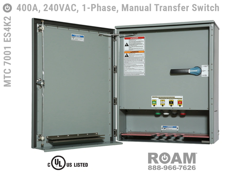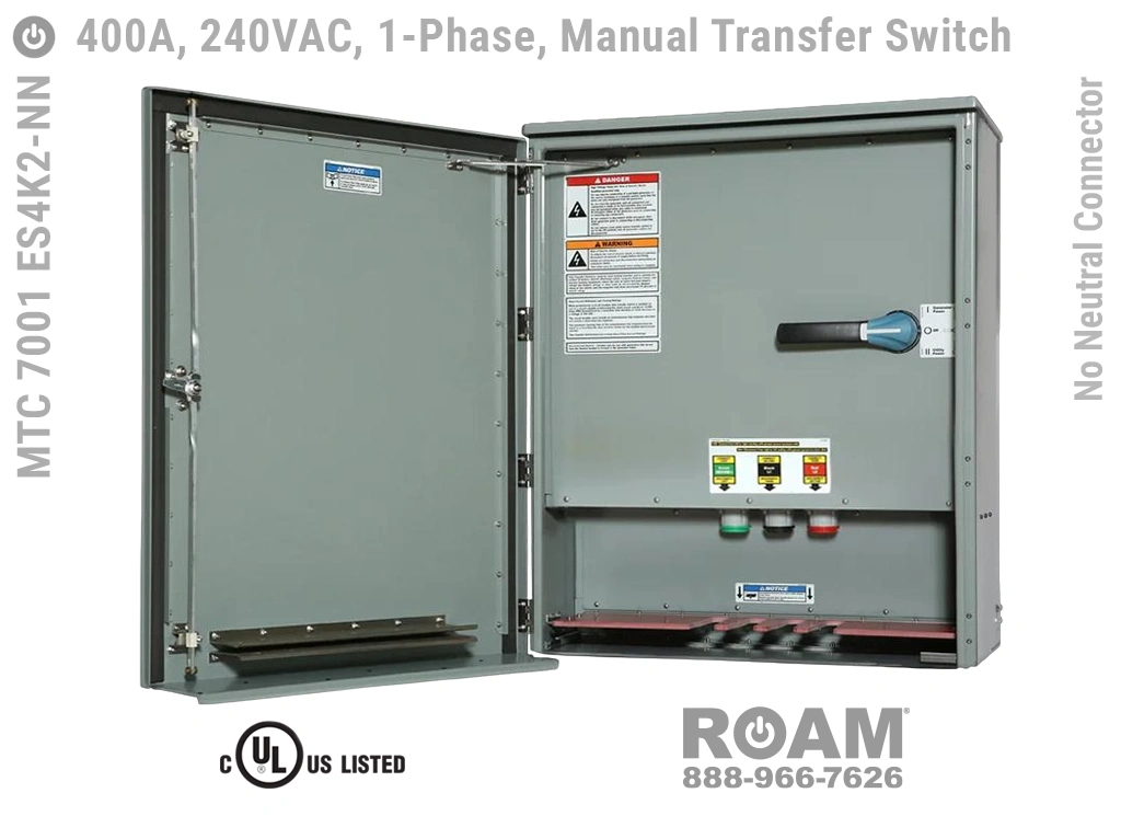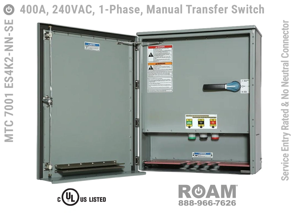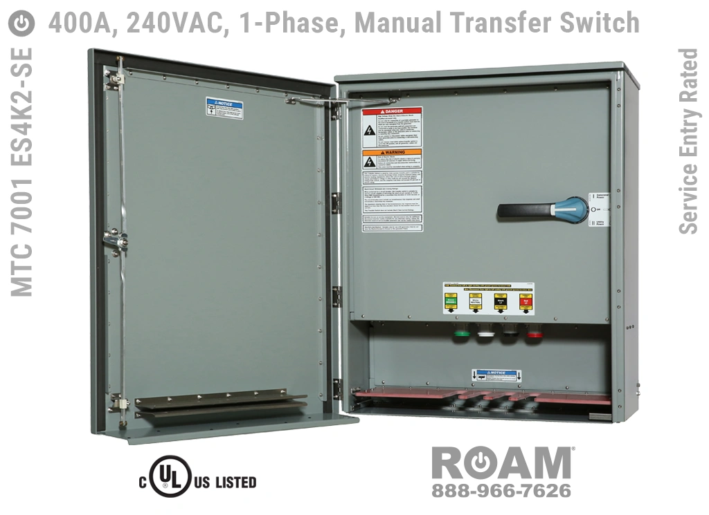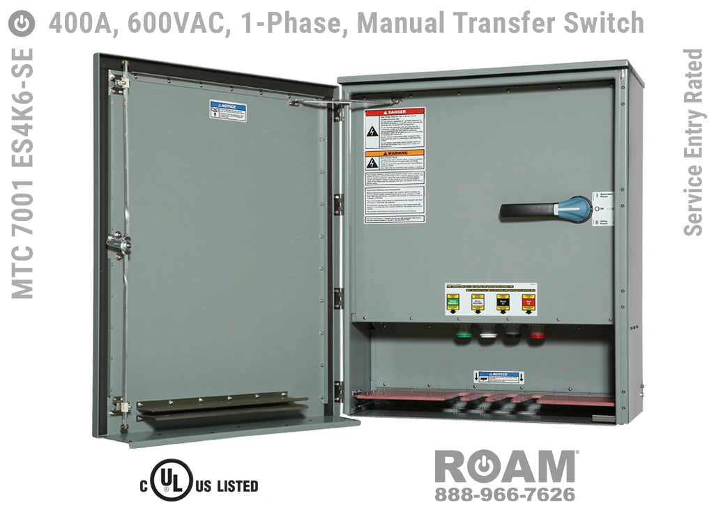 Many of Roam’s MTC 7001 ES4Kv series Manual Transfer Switch panels are Service Entry rated, meaning that these panels are suitable for use as service equipment/service disconnects. A service disconnect is simply the first disconnect between the external power source (utility or generator) and building main circuits. All of our Service Entry rated MTS panels have a “-SE” extension in their part number. Service Entry rated panels are available with a standard UL listing (USA), but not with a cUL (Canadian) listing.