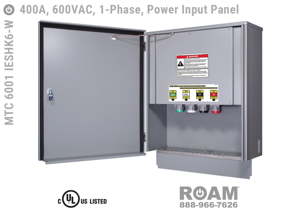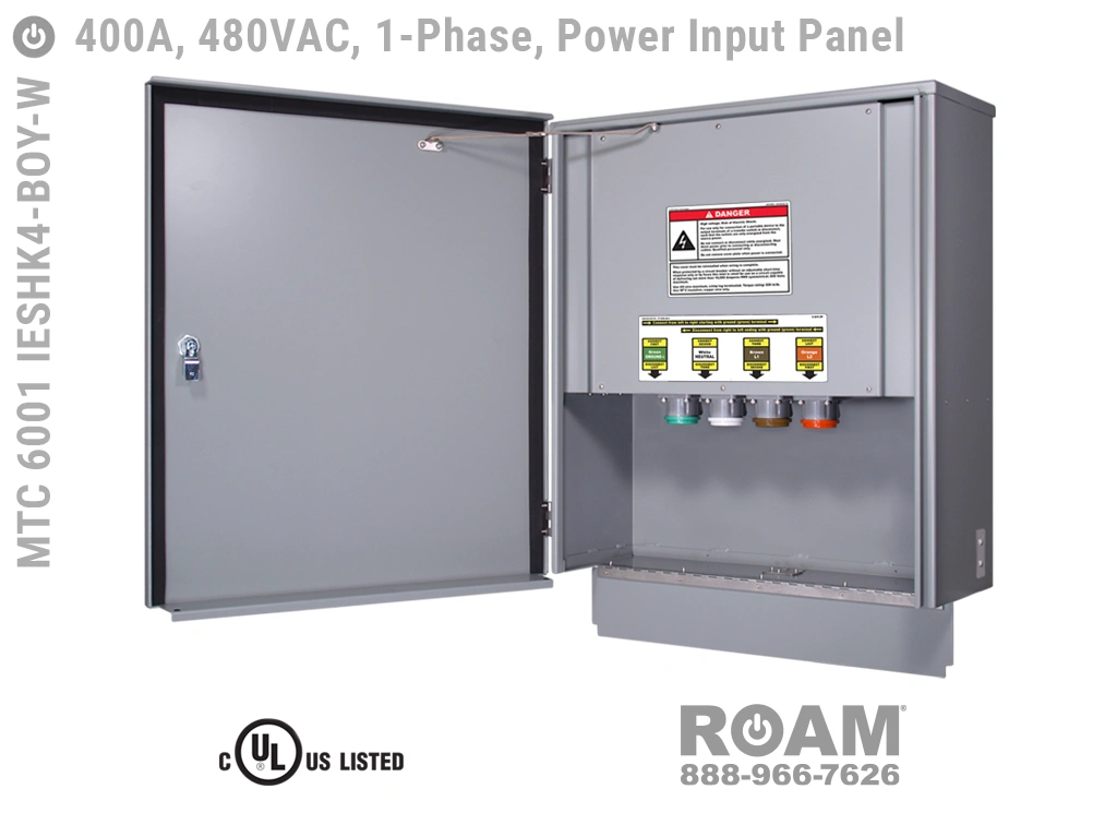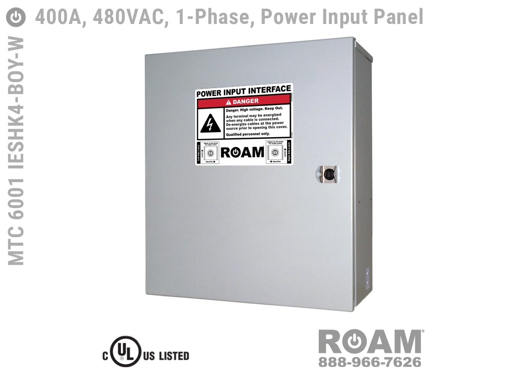 Roam offers MTC 6001 IESHKv-W Power Input Panels in models that support up to 240 VAC (120v, 208v, 230v, 240v)—MTC 6001 IESHK2-W, up to 480 VAC (277v, 330v, 440v, 480v)—MTC 6001 IESHK4-BOY-W, and up to 600 VAC (575v, 577v, 600v)—MTC 6001 IESHK6-W, which are UL Listed and cUL Listed (Canada) at those voltage levels. Brown-Orange color coding (for labels, Cam-Locks, & Cam-Lock spring caps) is normally used for most 480 VAC applications.