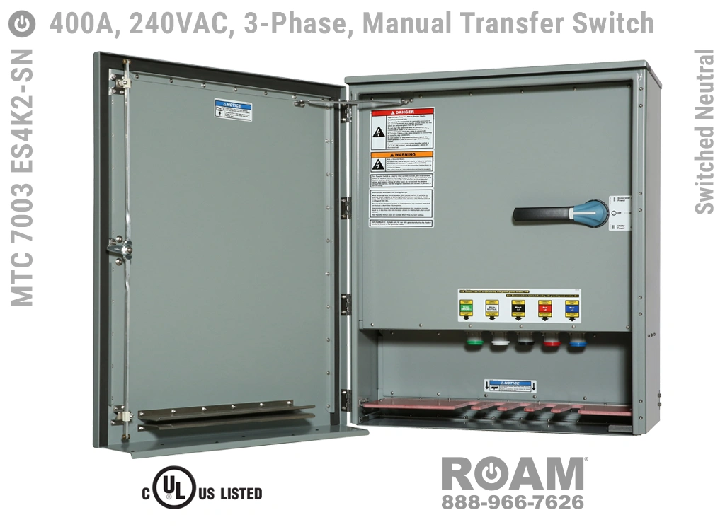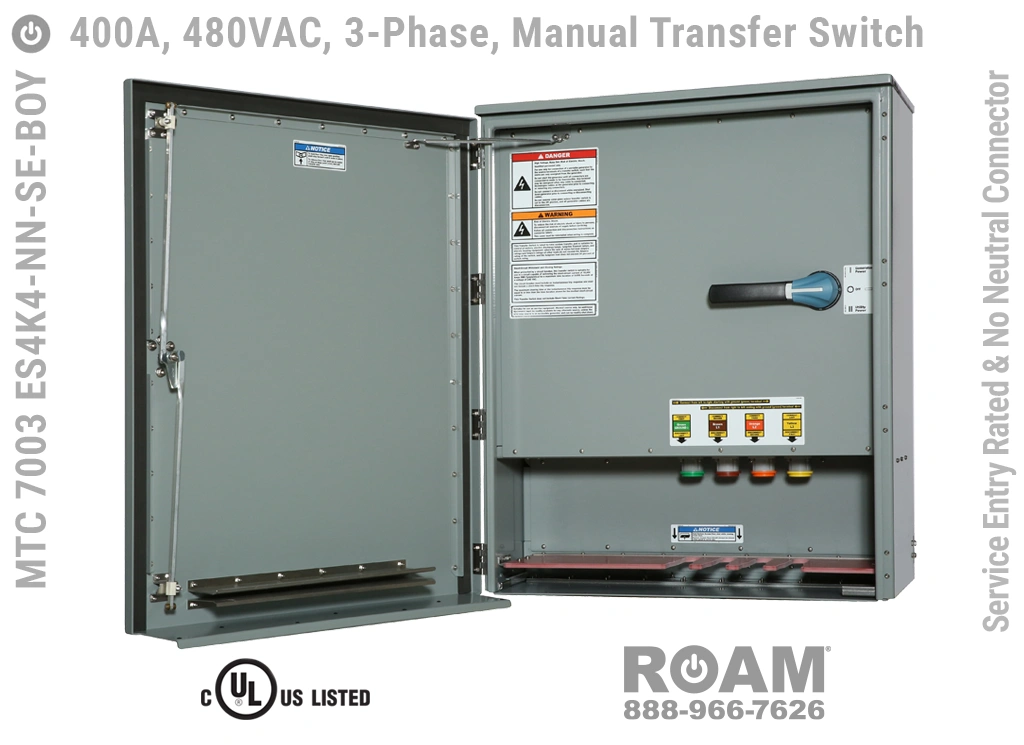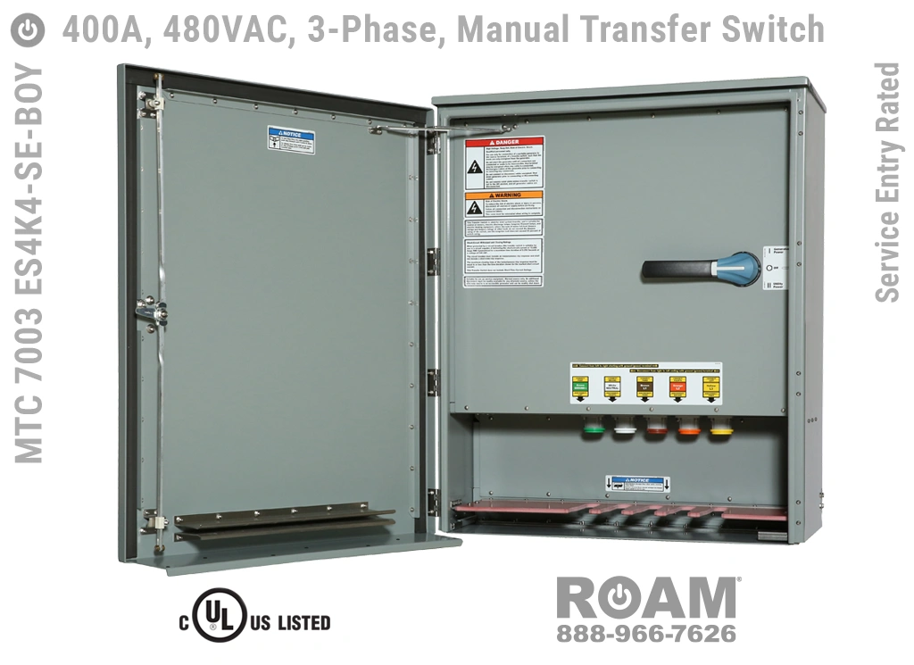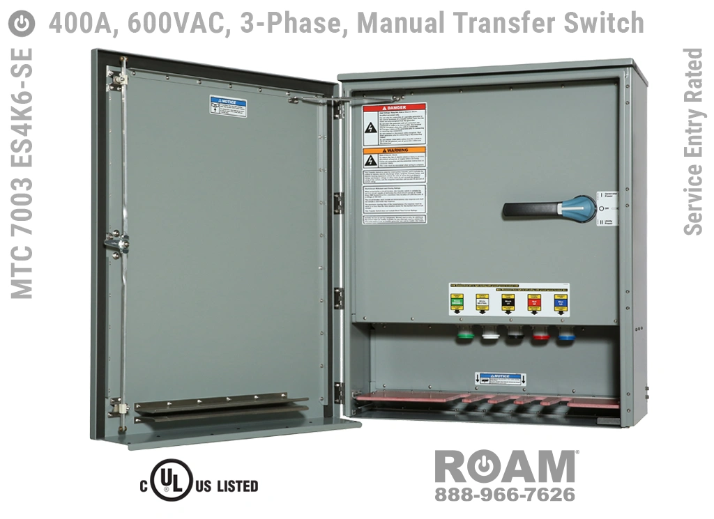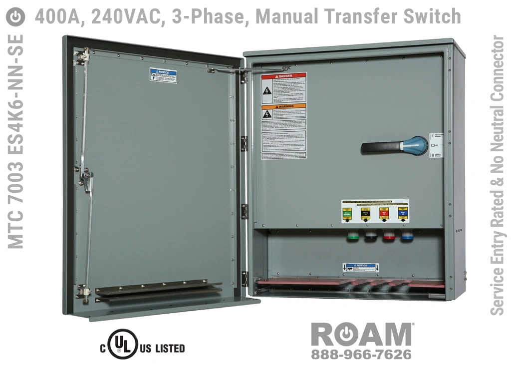 Many of Roam’s MTC 7003 ES4Kv series Manual Transfer Switch panels are Service Entry rated, meaning that these panels are suitable for use as service equipment/service disconnects. A service disconnect is simply the first disconnect between the external power source (utility or generator) and building main circuits. All of our Service Entry rated MTS panels have a “-SE” extension in their part number. Service Entry rated panels are available with a standard UL listing (USA), but not with a cUL (Canadian) listing.