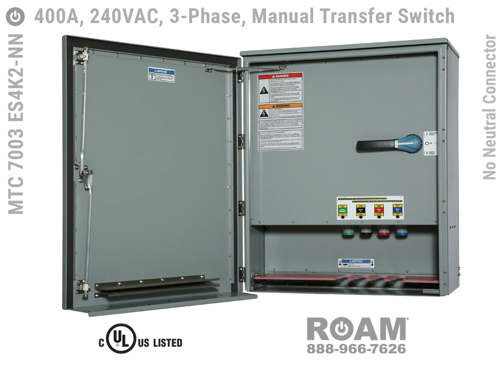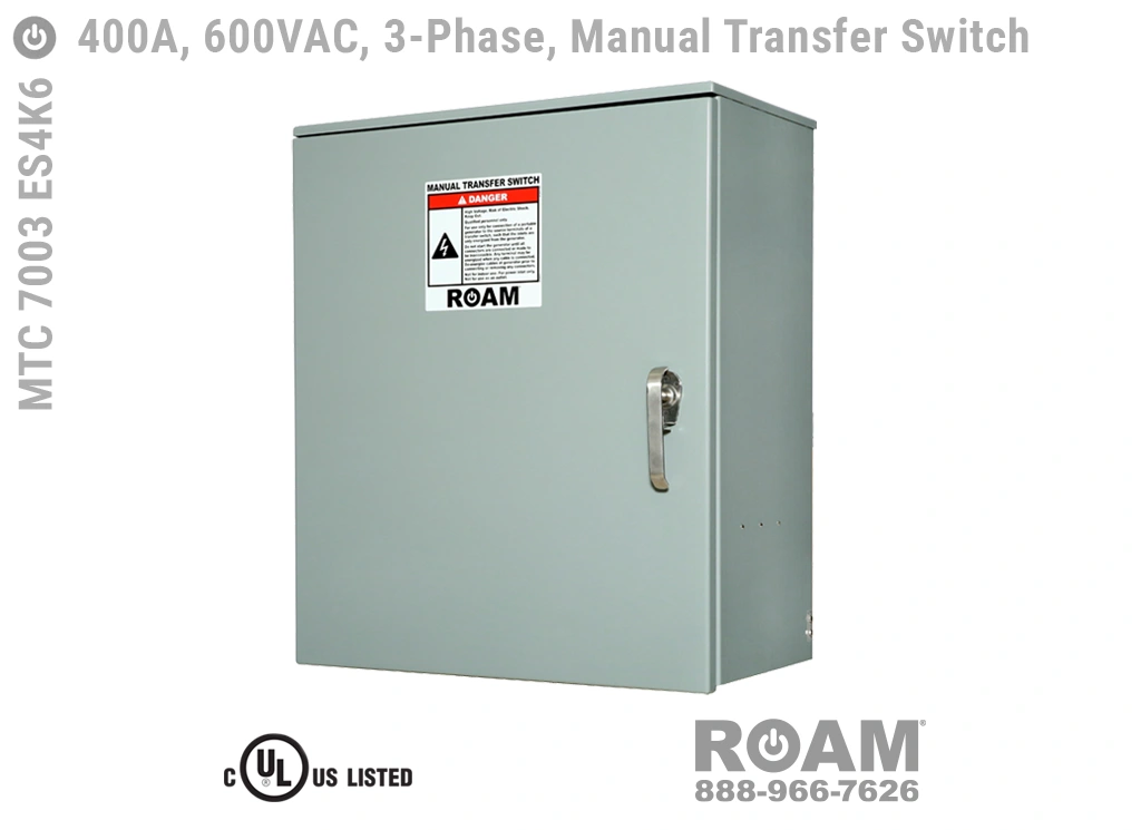 Roam’s MTC 7003 ES4Kv series (“v” = Voltage Code) of 400 Amp Manual Transfer Switch panels provide a secure and easy-to-connect Cam-Lock connection between a generator and building main power, letting you switch a building main circuits (by means of physically turning a switch) between utility power and generator power. Roam’s Manual Transfer Switch (MTS) panels combine a Generator Connection Box and a Transfer Switch, providing a single-panel solution for exterior connection and switching of emergency power. Roam’s MTS panels are UL 1008 listed and use E1016 (J-Series /16 Series) Male Cam-Lock connectors.