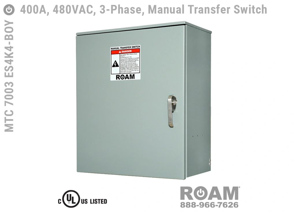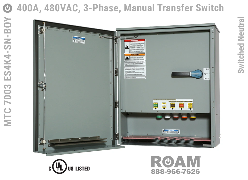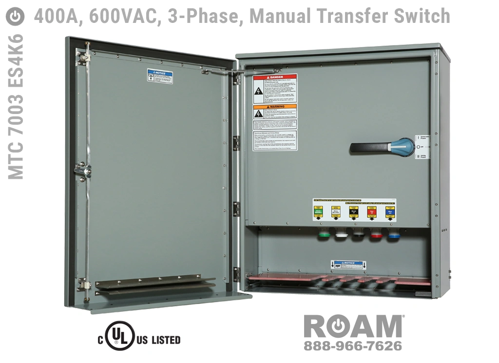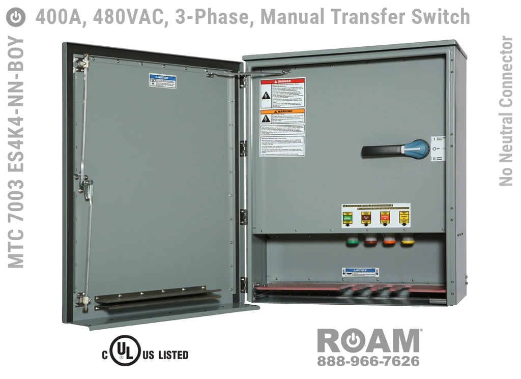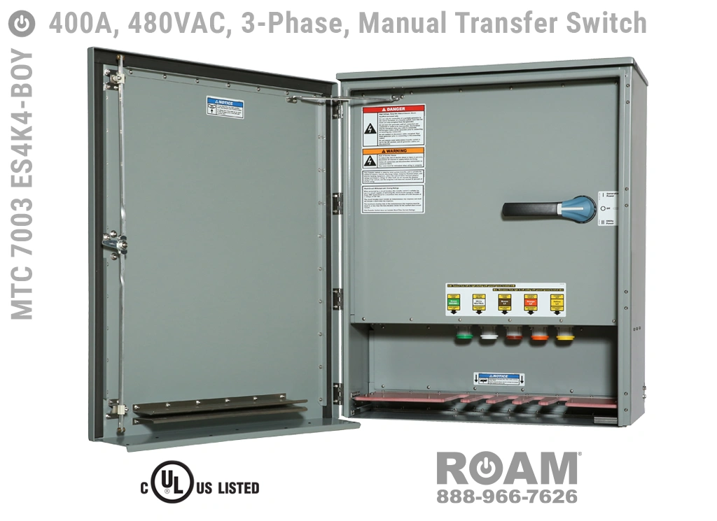 Voltages up to 600VACRoam offers MTC 7003 ES4Kv series 400 Amp Manual Transfer Switches in models that support up to 240 VAC (120v, 208v, 230v, 240v)—MTC 7003 ES4K2, up to 480 VAC (277v, 330v, 440v, 480v)—MTC 7003 ES4K4-BOY, and up to 600 VAC (575v, 577v, 600v)—MTC 7003 ES4K6, which are UL Listed at those voltage levels. Brown-Orange color coding (for labels, Cam-Locks, & Cam-Lock spring caps) is normally used for most 480 VAC applications.